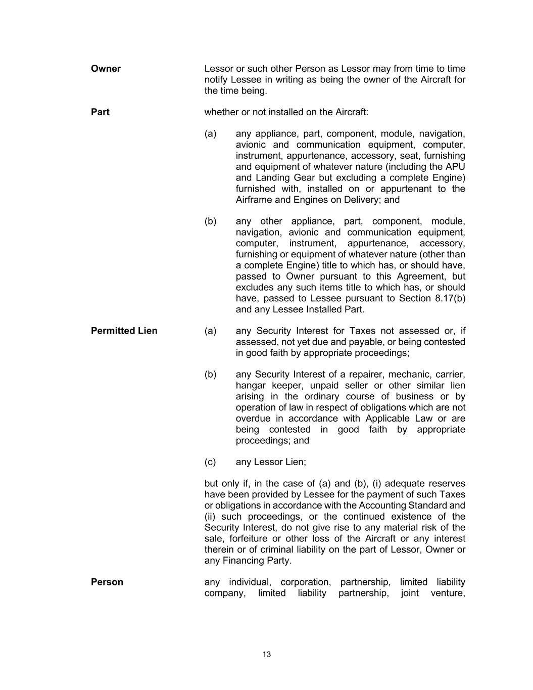 13 Owner Lessor or such other Person as Lessor may from time to time notify Lessee in writing as being the owner of the Aircraft for the time being. Part whether or not installed on the Aircraft: (a) any appliance, part, component, module, navigation, avionic and communication equipment, computer, instrument, appurtenance, accessory, seat, furnishing and equipment of whatever nature (including the APU and Landing Gear but excluding a complete Engine) furnished with, installed on or appurtenant to the Airframe and Engines on Delivery; and (b) any other appliance, part, component, module, navigation, avionic and communication equipment, computer, instrument, appurtenance, accessory, furnishing or equipment of whatever nature (other than a complete Engine) title to which has, or should have, passed to Owner pursuant to this Agreement, but excludes any such items title to which has, or should have, passed to Lessee pursuant to Section 8.17(b) and any Lessee Installed Part. Permitted Lien (a) any Security Interest for Taxes not assessed or, if assessed, not yet due and payable, or being contested in good faith by appropriate proceedings; (b) any Security Interest of a repairer, mechanic, carrier, hangar keeper, unpaid seller or other similar lien arising in the ordinary course of business or by operation of law in respect of obligations which are not overdue in accordance with Applicable Law or are being contested in good faith by appropriate proceedings; and (c) any Lessor Lien; but only if, in the case of (a) and (b), (i) adequate reserves have been provided by Lessee for the payment of such Taxes or obligations in accordance with the Accounting Standard and (ii) such proceedings, or the continued existence of the Security Interest, do not give rise to any material risk of the sale, forfeiture or other loss of the Aircraft or any interest therein or of criminal liability on the part of Lessor, Owner or any Financing Party. Person any individual, corporation, partnership, limited liability company, limited liability partnership, joint venture,