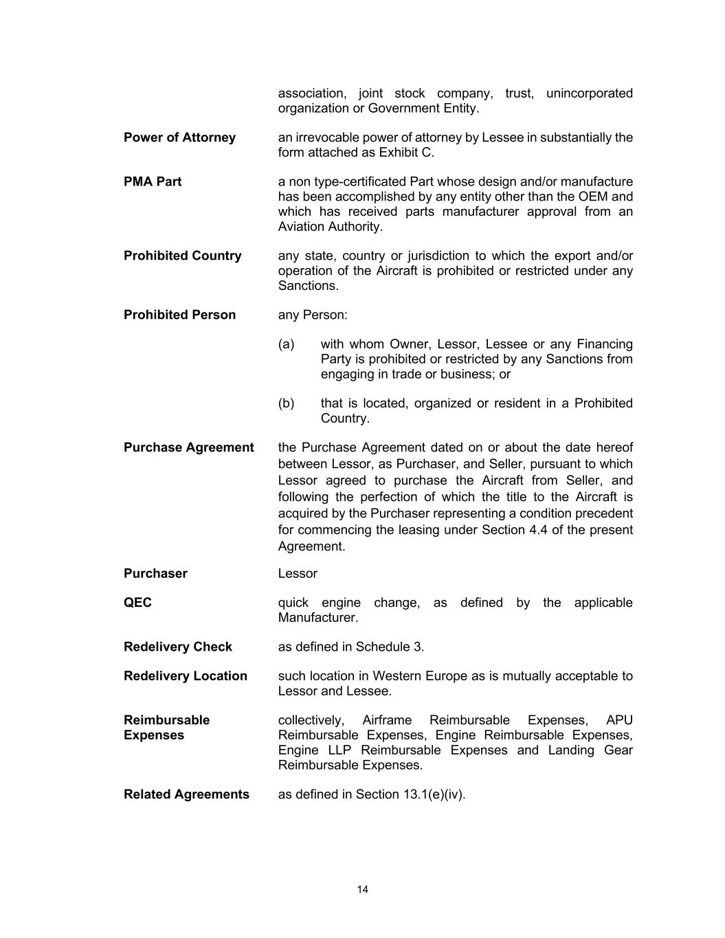 14 association, joint stock company, trust, unincorporated organization or Government Entity. Power of Attorney an irrevocable power of attorney by Lessee in substantially the form attached as Exhibit C. PMA Part a non type-certificated Part whose design and/or manufacture has been accomplished by any entity other than the OEM and which has received parts manufacturer approval from an Aviation Authority. Prohibited Country any state, country or jurisdiction to which the export and/or operation of the Aircraft is prohibited or restricted under any Sanctions. Prohibited Person any Person: (a) with whom Owner, Lessor, Lessee or any Financing Party is prohibited or restricted by any Sanctions from engaging in trade or business; or (b) that is located, organized or resident in a Prohibited Country. Purchase Agreement the Purchase Agreement dated on or about the date hereof between Lessor, as Purchaser, and Seller, pursuant to which Lessor agreed to purchase the Aircraft from Seller, and following the perfection of which the title to the Aircraft is acquired by the Purchaser representing a condition precedent for commencing the leasing under Section 4.4 of the present Agreement. Purchaser Lessor QEC quick engine change, as defined by the applicable Manufacturer. Redelivery Check as defined in Schedule 3. Redelivery Location such location in Western Europe as is mutually acceptable to Lessor and Lessee. Reimbursable Expenses collectively, Airframe Reimbursable Expenses, APU Reimbursable Expenses, Engine Reimbursable Expenses, Engine LLP Reimbursable Expenses and Landing Gear Reimbursable Expenses. Related Agreements as defined in Section 13.1(e)(iv).