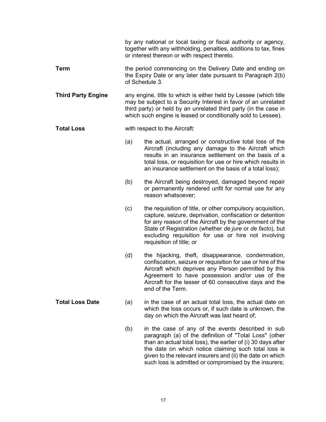 17 by any national or local taxing or fiscal authority or agency, together with any withholding, penalties, additions to tax, fines or interest thereon or with respect thereto. Term the period commencing on the Delivery Date and ending on the Expiry Date or any later date pursuant to Paragraph 2(b) of Schedule 3. Third Party Engine any engine, title to which is either held by Lessee (which title may be subject to a Security Interest in favor of an unrelated third party) or held by an unrelated third party (in the case in which such engine is leased or conditionally sold to Lessee). Total Loss with respect to the Aircraft: (a) the actual, arranged or constructive total loss of the Aircraft (including any damage to the Aircraft which results in an insurance settlement on the basis of a total loss, or requisition for use or hire which results in an insurance settlement on the basis of a total loss); (b) the Aircraft being destroyed, damaged beyond repair or permanently rendered unfit for normal use for any reason whatsoever; (c) the requisition of title, or other compulsory acquisition, capture, seizure, deprivation, confiscation or detention for any reason of the Aircraft by the government of the State of Registration (whether de jure or de facto), but excluding requisition for use or hire not involving requisition of title; or (d) the hijacking, theft, disappearance, condemnation, confiscation, seizure or requisition for use or hire of the Aircraft which deprives any Person permitted by this Agreement to have possession and/or use of the Aircraft for the lesser of 60 consecutive days and the end of the Term. Total Loss Date (a) in the case of an actual total loss, the actual date on which the loss occurs or, if such date is unknown, the day on which the Aircraft was last heard of; (b) in the case of any of the events described in sub paragraph (a) of the definition of "Total Loss" (other than an actual total loss), the earlier of (i) 30 days after the date on which notice claiming such total loss is given to the relevant insurers and (ii) the date on which such loss is admitted or compromised by the insurers;