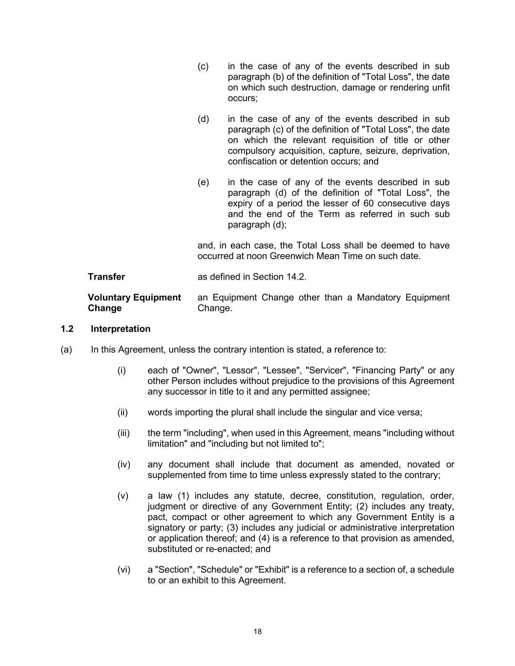 18 (c) in the case of any of the events described in sub paragraph (b) of the definition of "Total Loss", the date on which such destruction, damage or rendering unfit occurs; (d) in the case of any of the events described in sub paragraph (c) of the definition of "Total Loss", the date on which the relevant requisition of title or other compulsory acquisition, capture, seizure, deprivation, confiscation or detention occurs; and (e) in the case of any of the events described in sub paragraph (d) of the definition of "Total Loss", the expiry of a period the lesser of 60 consecutive days and the end of the Term as referred in such sub paragraph (d); and, in each case, the Total Loss shall be deemed to have occurred at noon Greenwich Mean Time on such date. Transfer as defined in Section 14.2. Voluntary Equipment Change an Equipment Change other than a Mandatory Equipment Change. 1.2 Interpretation (a) In this Agreement, unless the contrary intention is stated, a reference to: (i) each of "Owner", "Lessor", "Lessee", "Servicer", "Financing Party" or any other Person includes without prejudice to the provisions of this Agreement any successor in title to it and any permitted assignee; (ii) words importing the plural shall include the singular and vice versa; (iii) the term "including", when used in this Agreement, means "including without limitation" and "including but not limited to"; (iv) any document shall include that document as amended, novated or supplemented from time to time unless expressly stated to the contrary; (v) a law (1) includes any statute, decree, constitution, regulation, order, judgment or directive of any Government Entity; (2) includes any treaty, pact, compact or other agreement to which any Government Entity is a signatory or party; (3) includes any judicial or administrative interpretation or application thereof; and (4) is a reference to that provision as amended, substituted or re-enacted; and (vi) a "Section", "Schedule" or "Exhibit" is a reference to a section of, a schedule to or an exhibit to this Agreement.