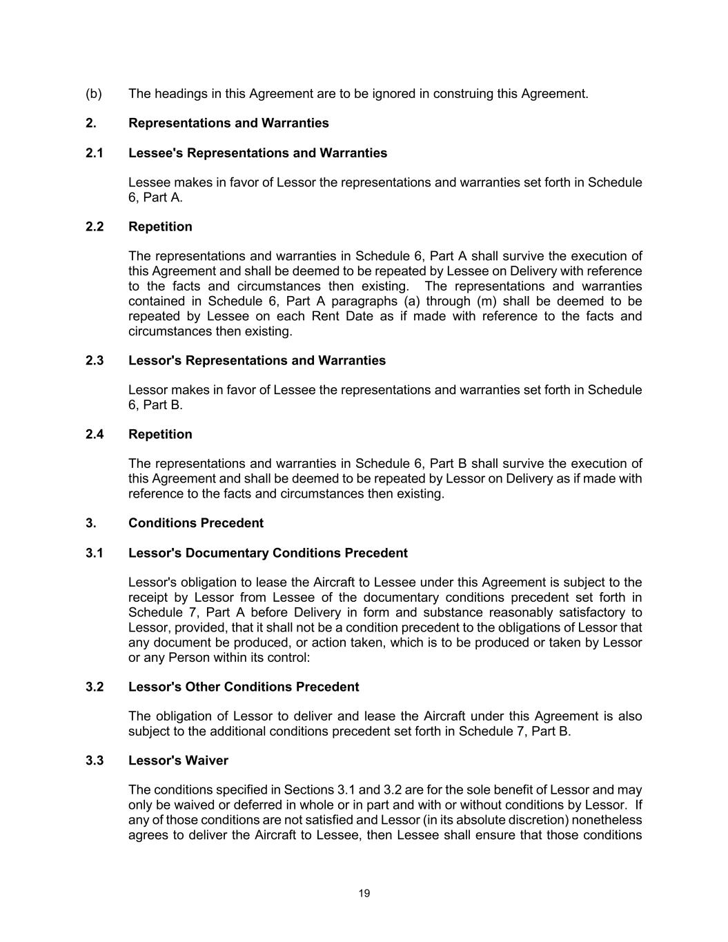 19 (b) The headings in this Agreement are to be ignored in construing this Agreement. 2. Representations and Warranties 2.1 Lessee's Representations and Warranties Lessee makes in favor of Lessor the representations and warranties set forth in Schedule 6, Part A. 2.2 Repetition The representations and warranties in Schedule 6, Part A shall survive the execution of this Agreement and shall be deemed to be repeated by Lessee on Delivery with reference to the facts and circumstances then existing. The representations and warranties contained in Schedule 6, Part A paragraphs (a) through (m) shall be deemed to be repeated by Lessee on each Rent Date as if made with reference to the facts and circumstances then existing. 2.3 Lessor's Representations and Warranties Lessor makes in favor of Lessee the representations and warranties set forth in Schedule 6, Part B. 2.4 Repetition The representations and warranties in Schedule 6, Part B shall survive the execution of this Agreement and shall be deemed to be repeated by Lessor on Delivery as if made with reference to the facts and circumstances then existing. 3. Conditions Precedent 3.1 Lessor's Documentary Conditions Precedent Lessor's obligation to lease the Aircraft to Lessee under this Agreement is subject to the receipt by Lessor from Lessee of the documentary conditions precedent set forth in Schedule 7, Part A before Delivery in form and substance reasonably satisfactory to Lessor, provided, that it shall not be a condition precedent to the obligations of Lessor that any document be produced, or action taken, which is to be produced or taken by Lessor or any Person within its control: 3.2 Lessor's Other Conditions Precedent The obligation of Lessor to deliver and lease the Aircraft under this Agreement is also subject to the additional conditions precedent set forth in Schedule 7, Part B. 3.3 Lessor's Waiver The conditions specified in Sections 3.1 and 3.2 are for the sole benefit of Lessor and may only be waived or deferred in whole or in part and with or without conditions by Lessor. If any of those conditions are not satisfied and Lessor (in its absolute discretion) nonetheless agrees to deliver the Aircraft to Lessee, then Lessee shall ensure that those conditions