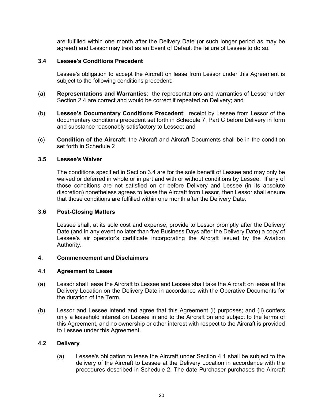 20 are fulfilled within one month after the Delivery Date (or such longer period as may be agreed) and Lessor may treat as an Event of Default the failure of Lessee to do so. 3.4 Lessee's Conditions Precedent Lessee's obligation to accept the Aircraft on lease from Lessor under this Agreement is subject to the following conditions precedent: (a) Representations and Warranties: the representations and warranties of Lessor under Section 2.4 are correct and would be correct if repeated on Delivery; and (b) Lessee’s Documentary Conditions Precedent: receipt by Lessee from Lessor of the documentary conditions precedent set forth in Schedule 7, Part C before Delivery in form and substance reasonably satisfactory to Lessee; and (c) Condition of the Aircraft: the Aircraft and Aircraft Documents shall be in the condition set forth in Schedule 2 3.5 Lessee's Waiver The conditions specified in Section 3.4 are for the sole benefit of Lessee and may only be waived or deferred in whole or in part and with or without conditions by Lessee. If any of those conditions are not satisfied on or before Delivery and Lessee (in its absolute discretion) nonetheless agrees to lease the Aircraft from Lessor, then Lessor shall ensure that those conditions are fulfilled within one month after the Delivery Date. 3.6 Post-Closing Matters Lessee shall, at its sole cost and expense, provide to Lessor promptly after the Delivery Date (and in any event no later than five Business Days after the Delivery Date) a copy of Lessee's air operator's certificate incorporating the Aircraft issued by the Aviation Authority. 4. Commencement and Disclaimers 4.1 Agreement to Lease (a) Lessor shall lease the Aircraft to Lessee and Lessee shall take the Aircraft on lease at the Delivery Location on the Delivery Date in accordance with the Operative Documents for the duration of the Term. (b) Lessor and Lessee intend and agree that this Agreement (i) purposes; and (ii) confers only a leasehold interest on Lessee in and to the Aircraft on and subject to the terms of this Agreement, and no ownership or other interest with respect to the Aircraft is provided to Lessee under this Agreement. 4.2 Delivery (a) Lessee's obligation to lease the Aircraft under Section 4.1 shall be subject to the delivery of the Aircraft to Lessee at the Delivery Location in accordance with the procedures described in Schedule 2. The date Purchaser purchases the Aircraft