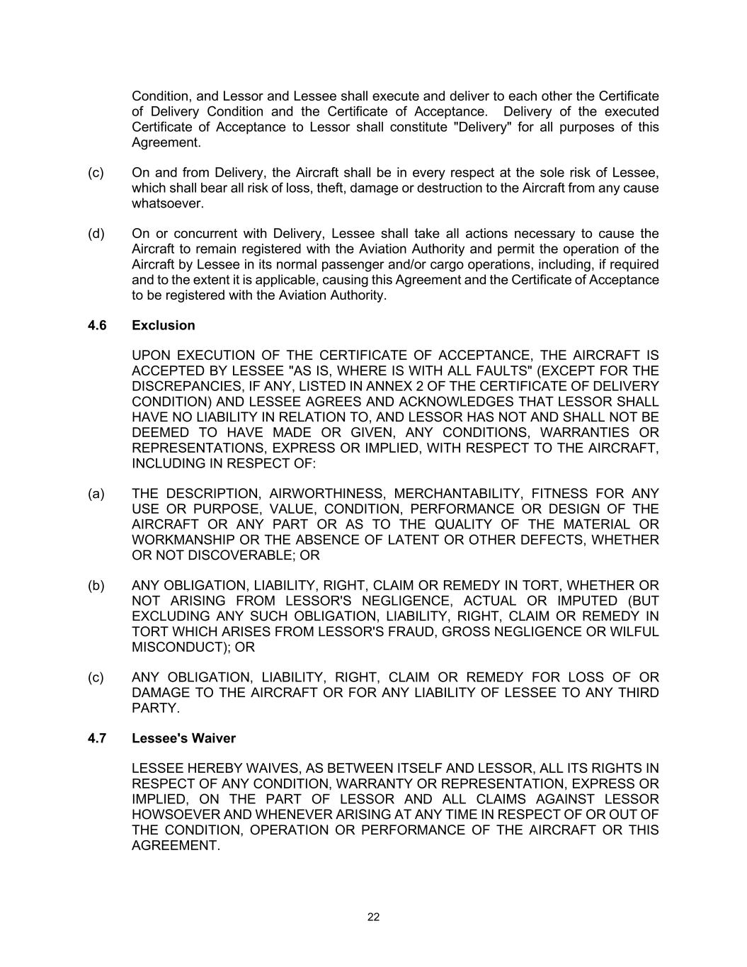 22 Condition, and Lessor and Lessee shall execute and deliver to each other the Certificate of Delivery Condition and the Certificate of Acceptance. Delivery of the executed Certificate of Acceptance to Lessor shall constitute "Delivery" for all purposes of this Agreement. (c) On and from Delivery, the Aircraft shall be in every respect at the sole risk of Lessee, which shall bear all risk of loss, theft, damage or destruction to the Aircraft from any cause whatsoever. (d) On or concurrent with Delivery, Lessee shall take all actions necessary to cause the Aircraft to remain registered with the Aviation Authority and permit the operation of the Aircraft by Lessee in its normal passenger and/or cargo operations, including, if required and to the extent it is applicable, causing this Agreement and the Certificate of Acceptance to be registered with the Aviation Authority. 4.6 Exclusion UPON EXECUTION OF THE CERTIFICATE OF ACCEPTANCE, THE AIRCRAFT IS ACCEPTED BY LESSEE "AS IS, WHERE IS WITH ALL FAULTS" (EXCEPT FOR THE DISCREPANCIES, IF ANY, LISTED IN ANNEX 2 OF THE CERTIFICATE OF DELIVERY CONDITION) AND LESSEE AGREES AND ACKNOWLEDGES THAT LESSOR SHALL HAVE NO LIABILITY IN RELATION TO, AND LESSOR HAS NOT AND SHALL NOT BE DEEMED TO HAVE MADE OR GIVEN, ANY CONDITIONS, WARRANTIES OR REPRESENTATIONS, EXPRESS OR IMPLIED, WITH RESPECT TO THE AIRCRAFT, INCLUDING IN RESPECT OF: (a) THE DESCRIPTION, AIRWORTHINESS, MERCHANTABILITY, FITNESS FOR ANY USE OR PURPOSE, VALUE, CONDITION, PERFORMANCE OR DESIGN OF THE AIRCRAFT OR ANY PART OR AS TO THE QUALITY OF THE MATERIAL OR WORKMANSHIP OR THE ABSENCE OF LATENT OR OTHER DEFECTS, WHETHER OR NOT DISCOVERABLE; OR (b) ANY OBLIGATION, LIABILITY, RIGHT, CLAIM OR REMEDY IN TORT, WHETHER OR NOT ARISING FROM LESSOR'S NEGLIGENCE, ACTUAL OR IMPUTED (BUT EXCLUDING ANY SUCH OBLIGATION, LIABILITY, RIGHT, CLAIM OR REMEDY IN TORT WHICH ARISES FROM LESSOR'S FRAUD, GROSS NEGLIGENCE OR WILFUL MISCONDUCT); OR (c) ANY OBLIGATION, LIABILITY, RIGHT, CLAIM OR REMEDY FOR LOSS OF OR DAMAGE TO THE AIRCRAFT OR FOR ANY LIABILITY OF LESSEE TO ANY THIRD PARTY. 4.7 Lessee's Waiver LESSEE HEREBY WAIVES, AS BETWEEN ITSELF AND LESSOR, ALL ITS RIGHTS IN RESPECT OF ANY CONDITION, WARRANTY OR REPRESENTATION, EXPRESS OR IMPLIED, ON THE PART OF LESSOR AND ALL CLAIMS AGAINST LESSOR HOWSOEVER AND WHENEVER ARISING AT ANY TIME IN RESPECT OF OR OUT OF THE CONDITION, OPERATION OR PERFORMANCE OF THE AIRCRAFT OR THIS AGREEMENT.