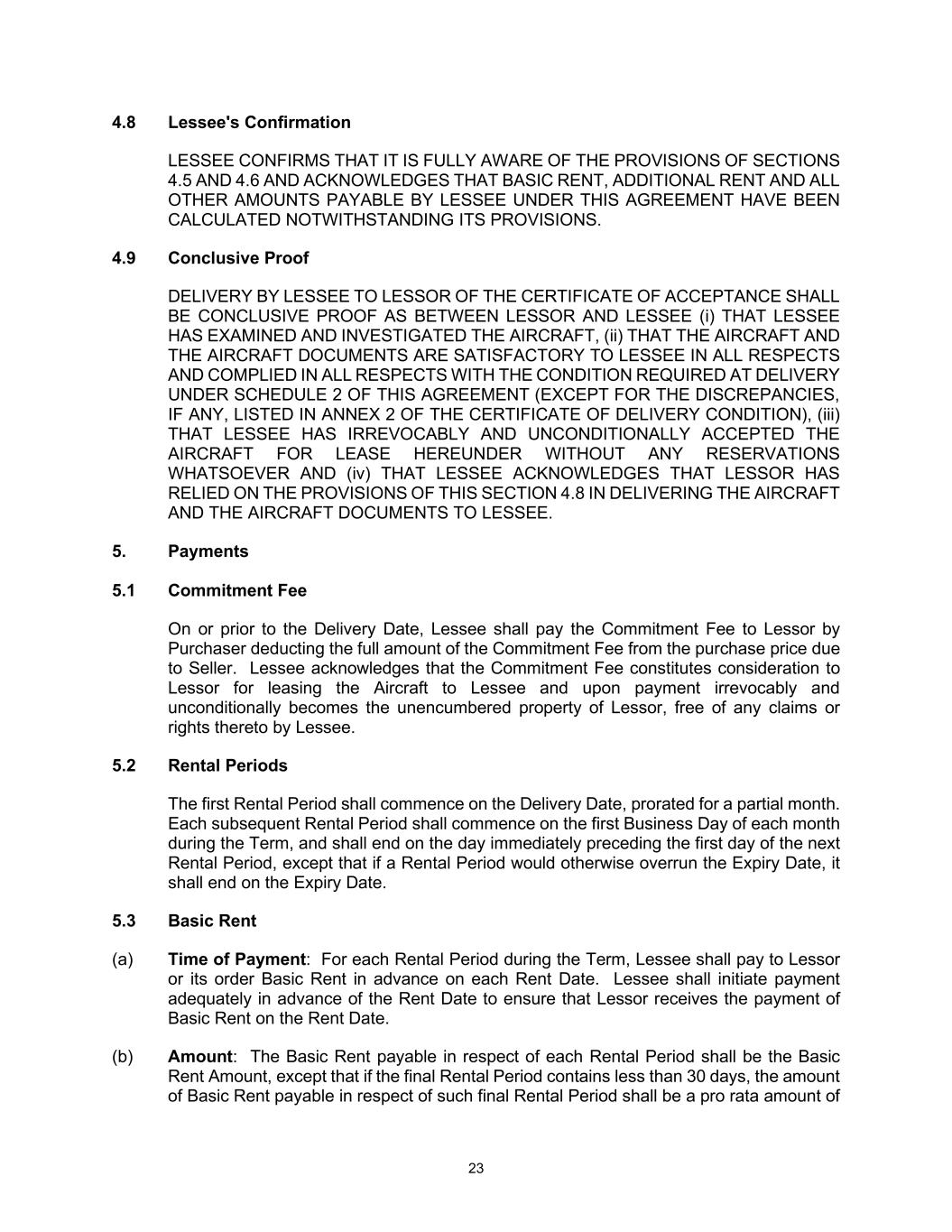 23 4.8 Lessee's Confirmation LESSEE CONFIRMS THAT IT IS FULLY AWARE OF THE PROVISIONS OF SECTIONS 4.5 AND 4.6 AND ACKNOWLEDGES THAT BASIC RENT, ADDITIONAL RENT AND ALL OTHER AMOUNTS PAYABLE BY LESSEE UNDER THIS AGREEMENT HAVE BEEN CALCULATED NOTWITHSTANDING ITS PROVISIONS. 4.9 Conclusive Proof DELIVERY BY LESSEE TO LESSOR OF THE CERTIFICATE OF ACCEPTANCE SHALL BE CONCLUSIVE PROOF AS BETWEEN LESSOR AND LESSEE (i) THAT LESSEE HAS EXAMINED AND INVESTIGATED THE AIRCRAFT, (ii) THAT THE AIRCRAFT AND THE AIRCRAFT DOCUMENTS ARE SATISFACTORY TO LESSEE IN ALL RESPECTS AND COMPLIED IN ALL RESPECTS WITH THE CONDITION REQUIRED AT DELIVERY UNDER SCHEDULE 2 OF THIS AGREEMENT (EXCEPT FOR THE DISCREPANCIES, IF ANY, LISTED IN ANNEX 2 OF THE CERTIFICATE OF DELIVERY CONDITION), (iii) THAT LESSEE HAS IRREVOCABLY AND UNCONDITIONALLY ACCEPTED THE AIRCRAFT FOR LEASE HEREUNDER WITHOUT ANY RESERVATIONS WHATSOEVER AND (iv) THAT LESSEE ACKNOWLEDGES THAT LESSOR HAS RELIED ON THE PROVISIONS OF THIS SECTION 4.8 IN DELIVERING THE AIRCRAFT AND THE AIRCRAFT DOCUMENTS TO LESSEE. 5. Payments 5.1 Commitment Fee On or prior to the Delivery Date, Lessee shall pay the Commitment Fee to Lessor by Purchaser deducting the full amount of the Commitment Fee from the purchase price due to Seller. Lessee acknowledges that the Commitment Fee constitutes consideration to Lessor for leasing the Aircraft to Lessee and upon payment irrevocably and unconditionally becomes the unencumbered property of Lessor, free of any claims or rights thereto by Lessee. 5.2 Rental Periods The first Rental Period shall commence on the Delivery Date, prorated for a partial month. Each subsequent Rental Period shall commence on the first Business Day of each month during the Term, and shall end on the day immediately preceding the first day of the next Rental Period, except that if a Rental Period would otherwise overrun the Expiry Date, it shall end on the Expiry Date. 5.3 Basic Rent (a) Time of Payment: For each Rental Period during the Term, Lessee shall pay to Lessor or its order Basic Rent in advance on each Rent Date. Lessee shall initiate payment adequately in advance of the Rent Date to ensure that Lessor receives the payment of Basic Rent on the Rent Date. (b) Amount: The Basic Rent payable in respect of each Rental Period shall be the Basic Rent Amount, except that if the final Rental Period contains less than 30 days, the amount of Basic Rent payable in respect of such final Rental Period shall be a pro rata amount of