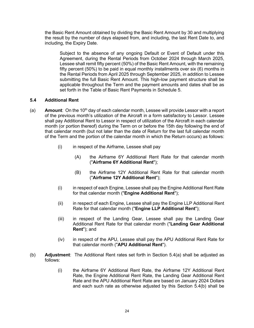 24 the Basic Rent Amount obtained by dividing the Basic Rent Amount by 30 and multiplying the result by the number of days elapsed from, and including, the last Rent Date to, and including, the Expiry Date. Subject to the absence of any ongoing Default or Event of Default under this Agreement, during the Rental Periods from October 2024 through March 2025, Lessee shall remit fifty percent (50%) of the Basic Rent Amount, with the remaining fifty percent (50%) to be paid in equal monthly installments over six (6) months in the Rental Periods from April 2025 through September 2025, in addition to Lessee submitting the full Basic Rent Amount. This high-low payment structure shall be applicable throughout the Term and the payment amounts and dates shall be as set forth in the Table of Basic Rent Payments in Schedule 5. 5.4 Additional Rent (a) Amount: On the 10th day of each calendar month, Lessee will provide Lessor with a report of the previous month’s utilization of the Aircraft in a form satisfactory to Lessor. Lessee shall pay Additional Rent to Lessor in respect of utilization of the Aircraft in each calendar month (or portion thereof) during the Term on or before the 15th day following the end of that calendar month (but not later than the date of Return for the last full calendar month of the Term and the portion of the calendar month in which the Return occurs) as follows: (i) in respect of the Airframe, Lessee shall pay (A) the Airframe 6Y Additional Rent Rate for that calendar month ("Airframe 6Y Additional Rent"); (B) the Airframe 12Y Additional Rent Rate for that calendar month ("Airframe 12Y Additional Rent"); (i) in respect of each Engine, Lessee shall pay the Engine Additional Rent Rate for that calendar month ("Engine Additional Rent"); (ii) in respect of each Engine, Lessee shall pay the Engine LLP Additional Rent Rate for that calendar month ("Engine LLP Additional Rent"); (iii) in respect of the Landing Gear, Lessee shall pay the Landing Gear Additional Rent Rate for that calendar month ("Landing Gear Additional Rent"); and (iv) in respect of the APU, Lessee shall pay the APU Additional Rent Rate for that calendar month ("APU Additional Rent"). (b) Adjustment: The Additional Rent rates set forth in Section 5.4(a) shall be adjusted as follows: (i) the Airframe 6Y Additional Rent Rate, the Airframe 12Y Additional Rent Rate, the Engine Additional Rent Rate, the Landing Gear Additional Rent Rate and the APU Additional Rent Rate are based on January 2024 Dollars and each such rate as otherwise adjusted by this Section 5.4(b) shall be
