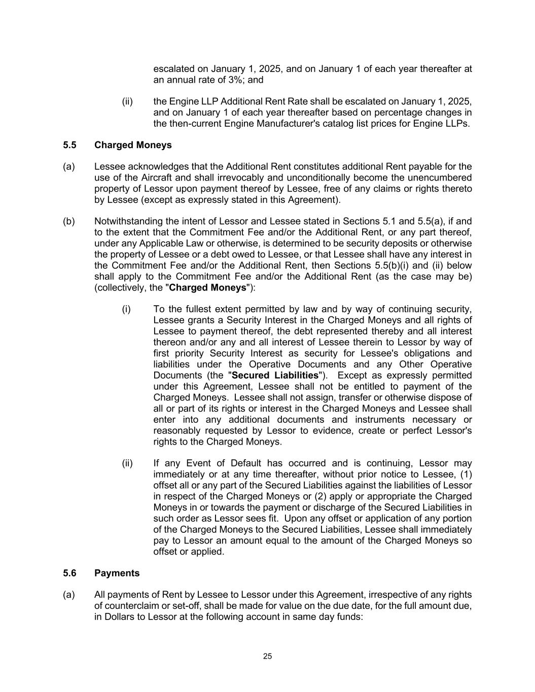25 escalated on January 1, 2025, and on January 1 of each year thereafter at an annual rate of 3%; and (ii) the Engine LLP Additional Rent Rate shall be escalated on January 1, 2025, and on January 1 of each year thereafter based on percentage changes in the then-current Engine Manufacturer's catalog list prices for Engine LLPs. 5.5 Charged Moneys (a) Lessee acknowledges that the Additional Rent constitutes additional Rent payable for the use of the Aircraft and shall irrevocably and unconditionally become the unencumbered property of Lessor upon payment thereof by Lessee, free of any claims or rights thereto by Lessee (except as expressly stated in this Agreement). (b) Notwithstanding the intent of Lessor and Lessee stated in Sections 5.1 and 5.5(a), if and to the extent that the Commitment Fee and/or the Additional Rent, or any part thereof, under any Applicable Law or otherwise, is determined to be security deposits or otherwise the property of Lessee or a debt owed to Lessee, or that Lessee shall have any interest in the Commitment Fee and/or the Additional Rent, then Sections 5.5(b)(i) and (ii) below shall apply to the Commitment Fee and/or the Additional Rent (as the case may be) (collectively, the "Charged Moneys"): (i) To the fullest extent permitted by law and by way of continuing security, Lessee grants a Security Interest in the Charged Moneys and all rights of Lessee to payment thereof, the debt represented thereby and all interest thereon and/or any and all interest of Lessee therein to Lessor by way of first priority Security Interest as security for Lessee's obligations and liabilities under the Operative Documents and any Other Operative Documents (the "Secured Liabilities"). Except as expressly permitted under this Agreement, Lessee shall not be entitled to payment of the Charged Moneys. Lessee shall not assign, transfer or otherwise dispose of all or part of its rights or interest in the Charged Moneys and Lessee shall enter into any additional documents and instruments necessary or reasonably requested by Lessor to evidence, create or perfect Lessor's rights to the Charged Moneys. (ii) If any Event of Default has occurred and is continuing, Lessor may immediately or at any time thereafter, without prior notice to Lessee, (1) offset all or any part of the Secured Liabilities against the liabilities of Lessor in respect of the Charged Moneys or (2) apply or appropriate the Charged Moneys in or towards the payment or discharge of the Secured Liabilities in such order as Lessor sees fit. Upon any offset or application of any portion of the Charged Moneys to the Secured Liabilities, Lessee shall immediately pay to Lessor an amount equal to the amount of the Charged Moneys so offset or applied. 5.6 Payments (a) All payments of Rent by Lessee to Lessor under this Agreement, irrespective of any rights of counterclaim or set-off, shall be made for value on the due date, for the full amount due, in Dollars to Lessor at the following account in same day funds: