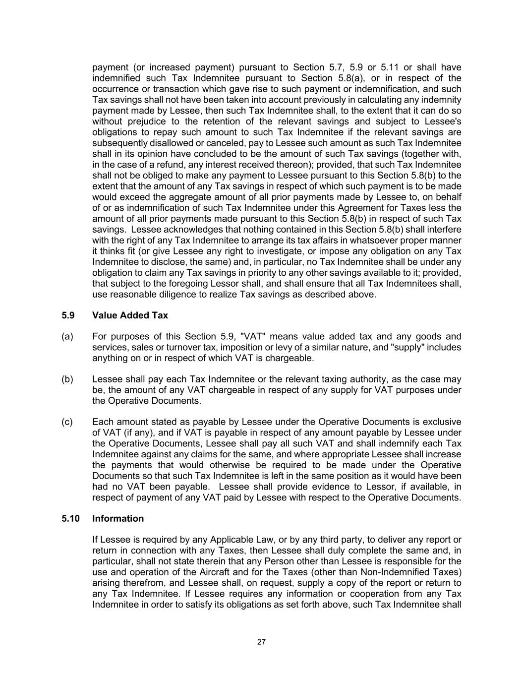27 payment (or increased payment) pursuant to Section 5.7, 5.9 or 5.11 or shall have indemnified such Tax Indemnitee pursuant to Section 5.8(a), or in respect of the occurrence or transaction which gave rise to such payment or indemnification, and such Tax savings shall not have been taken into account previously in calculating any indemnity payment made by Lessee, then such Tax Indemnitee shall, to the extent that it can do so without prejudice to the retention of the relevant savings and subject to Lessee's obligations to repay such amount to such Tax Indemnitee if the relevant savings are subsequently disallowed or canceled, pay to Lessee such amount as such Tax Indemnitee shall in its opinion have concluded to be the amount of such Tax savings (together with, in the case of a refund, any interest received thereon); provided, that such Tax Indemnitee shall not be obliged to make any payment to Lessee pursuant to this Section 5.8(b) to the extent that the amount of any Tax savings in respect of which such payment is to be made would exceed the aggregate amount of all prior payments made by Lessee to, on behalf of or as indemnification of such Tax Indemnitee under this Agreement for Taxes less the amount of all prior payments made pursuant to this Section 5.8(b) in respect of such Tax savings. Lessee acknowledges that nothing contained in this Section 5.8(b) shall interfere with the right of any Tax Indemnitee to arrange its tax affairs in whatsoever proper manner it thinks fit (or give Lessee any right to investigate, or impose any obligation on any Tax Indemnitee to disclose, the same) and, in particular, no Tax Indemnitee shall be under any obligation to claim any Tax savings in priority to any other savings available to it; provided, that subject to the foregoing Lessor shall, and shall ensure that all Tax Indemnitees shall, use reasonable diligence to realize Tax savings as described above. 5.9 Value Added Tax (a) For purposes of this Section 5.9, "VAT" means value added tax and any goods and services, sales or turnover tax, imposition or levy of a similar nature, and "supply" includes anything on or in respect of which VAT is chargeable. (b) Lessee shall pay each Tax Indemnitee or the relevant taxing authority, as the case may be, the amount of any VAT chargeable in respect of any supply for VAT purposes under the Operative Documents. (c) Each amount stated as payable by Lessee under the Operative Documents is exclusive of VAT (if any), and if VAT is payable in respect of any amount payable by Lessee under the Operative Documents, Lessee shall pay all such VAT and shall indemnify each Tax Indemnitee against any claims for the same, and where appropriate Lessee shall increase the payments that would otherwise be required to be made under the Operative Documents so that such Tax Indemnitee is left in the same position as it would have been had no VAT been payable. Lessee shall provide evidence to Lessor, if available, in respect of payment of any VAT paid by Lessee with respect to the Operative Documents. 5.10 Information If Lessee is required by any Applicable Law, or by any third party, to deliver any report or return in connection with any Taxes, then Lessee shall duly complete the same and, in particular, shall not state therein that any Person other than Lessee is responsible for the use and operation of the Aircraft and for the Taxes (other than Non-Indemnified Taxes) arising therefrom, and Lessee shall, on request, supply a copy of the report or return to any Tax Indemnitee. If Lessee requires any information or cooperation from any Tax Indemnitee in order to satisfy its obligations as set forth above, such Tax Indemnitee shall
