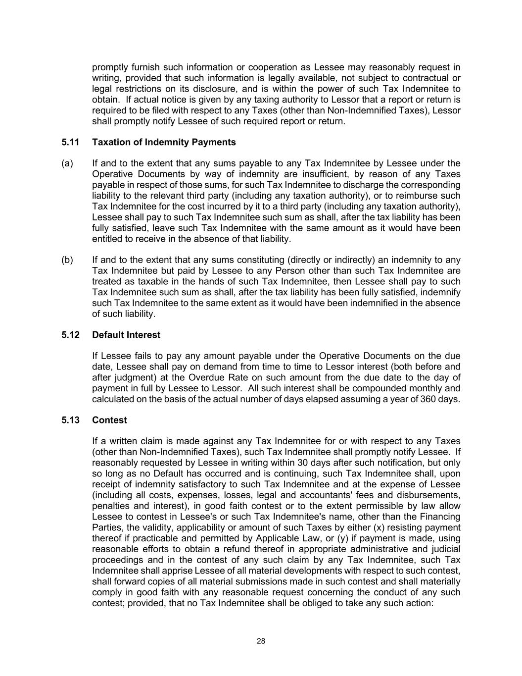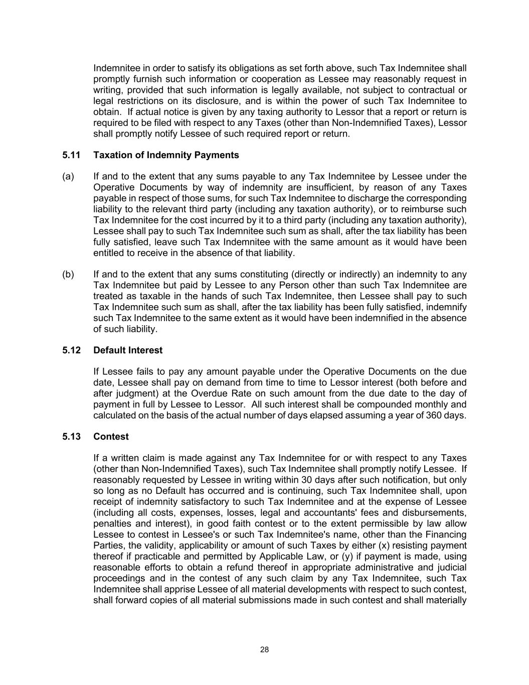 28 promptly furnish such information or cooperation as Lessee may reasonably request in writing, provided that such information is legally available, not subject to contractual or legal restrictions on its disclosure, and is within the power of such Tax Indemnitee to obtain. If actual notice is given by any taxing authority to Lessor that a report or return is required to be filed with respect to any Taxes (other than Non-Indemnified Taxes), Lessor shall promptly notify Lessee of such required report or return. 5.11 Taxation of Indemnity Payments (a) If and to the extent that any sums payable to any Tax Indemnitee by Lessee under the Operative Documents by way of indemnity are insufficient, by reason of any Taxes payable in respect of those sums, for such Tax Indemnitee to discharge the corresponding liability to the relevant third party (including any taxation authority), or to reimburse such Tax Indemnitee for the cost incurred by it to a third party (including any taxation authority), Lessee shall pay to such Tax Indemnitee such sum as shall, after the tax liability has been fully satisfied, leave such Tax Indemnitee with the same amount as it would have been entitled to receive in the absence of that liability. (b) If and to the extent that any sums constituting (directly or indirectly) an indemnity to any Tax Indemnitee but paid by Lessee to any Person other than such Tax Indemnitee are treated as taxable in the hands of such Tax Indemnitee, then Lessee shall pay to such Tax Indemnitee such sum as shall, after the tax liability has been fully satisfied, indemnify such Tax Indemnitee to the same extent as it would have been indemnified in the absence of such liability. 5.12 Default Interest If Lessee fails to pay any amount payable under the Operative Documents on the due date, Lessee shall pay on demand from time to time to Lessor interest (both before and after judgment) at the Overdue Rate on such amount from the due date to the day of payment in full by Lessee to Lessor. All such interest shall be compounded monthly and calculated on the basis of the actual number of days elapsed assuming a year of 360 days. 5.13 Contest If a written claim is made against any Tax Indemnitee for or with respect to any Taxes (other than Non-Indemnified Taxes), such Tax Indemnitee shall promptly notify Lessee. If reasonably requested by Lessee in writing within 30 days after such notification, but only so long as no Default has occurred and is continuing, such Tax Indemnitee shall, upon receipt of indemnity satisfactory to such Tax Indemnitee and at the expense of Lessee (including all costs, expenses, losses, legal and accountants' fees and disbursements, penalties and interest), in good faith contest or to the extent permissible by law allow Lessee to contest in Lessee's or such Tax Indemnitee's name, other than the Financing Parties, the validity, applicability or amount of such Taxes by either (x) resisting payment thereof if practicable and permitted by Applicable Law, or (y) if payment is made, using reasonable efforts to obtain a refund thereof in appropriate administrative and judicial proceedings and in the contest of any such claim by any Tax Indemnitee, such Tax Indemnitee shall apprise Lessee of all material developments with respect to such contest, shall forward copies of all material submissions made in such contest and shall materially comply in good faith with any reasonable request concerning the conduct of any such contest; provided, that no Tax Indemnitee shall be obliged to take any such action: