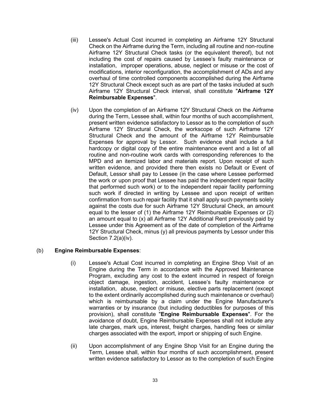 33 (iii) Lessee's Actual Cost incurred in completing an Airframe 12Y Structural Check on the Airframe during the Term, including all routine and non-routine Airframe 12Y Structural Check tasks (or the equivalent thereof), but not including the cost of repairs caused by Lessee’s faulty maintenance or installation, improper operations, abuse, neglect or misuse or the cost of modifications, interior reconfiguration, the accomplishment of ADs and any overhaul of time controlled components accomplished during the Airframe 12Y Structural Check except such as are part of the tasks included at such Airframe 12Y Structural Check interval, shall constitute "Airframe 12Y Reimbursable Expenses". (iv) Upon the completion of an Airframe 12Y Structural Check on the Airframe during the Term, Lessee shall, within four months of such accomplishment, present written evidence satisfactory to Lessor as to the completion of such Airframe 12Y Structural Check, the workscope of such Airframe 12Y Structural Check and the amount of the Airframe 12Y Reimbursable Expenses for approval by Lessor. Such evidence shall include a full hardcopy or digital copy of the entire maintenance event and a list of all routine and non-routine work cards with corresponding references to the MPD and an itemized labor and materials report. Upon receipt of such written evidence, and provided there then exists no Default or Event of Default, Lessor shall pay to Lessee (in the case where Lessee performed the work or upon proof that Lessee has paid the independent repair facility that performed such work) or to the independent repair facility performing such work if directed in writing by Lessee and upon receipt of written confirmation from such repair facility that it shall apply such payments solely against the costs due for such Airframe 12Y Structural Check, an amount equal to the lesser of (1) the Airframe 12Y Reimbursable Expenses or (2) an amount equal to (x) all Airframe 12Y Additional Rent previously paid by Lessee under this Agreement as of the date of completion of the Airframe 12Y Structural Check, minus (y) all previous payments by Lessor under this Section 7.2(a)(iv). (b) Engine Reimbursable Expenses: (i) Lessee's Actual Cost incurred in completing an Engine Shop Visit of an Engine during the Term in accordance with the Approved Maintenance Program, excluding any cost to the extent incurred in respect of foreign object damage, ingestion, accident, Lessee’s faulty maintenance or installation, abuse, neglect or misuse, elective parts replacement (except to the extent ordinarily accomplished during such maintenance or overhaul) which is reimbursable by a claim under the Engine Manufacturer's warranties or by insurance (but including deductibles for purposes of this provision), shall constitute "Engine Reimbursable Expenses". For the avoidance of doubt, Engine Reimbursable Expenses shall not include any late charges, mark ups, interest, freight charges, handling fees or similar charges associated with the export, import or shipping of such Engine. (ii) Upon accomplishment of any Engine Shop Visit for an Engine during the Term, Lessee shall, within four months of such accomplishment, present written evidence satisfactory to Lessor as to the completion of such Engine