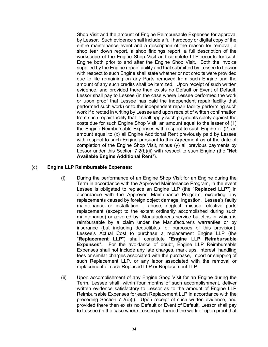 34 Shop Visit and the amount of Engine Reimbursable Expenses for approval by Lessor. Such evidence shall include a full hardcopy or digital copy of the entire maintenance event and a description of the reason for removal, a shop tear down report, a shop findings report, a full description of the workscope of the Engine Shop Visit and complete LLP records for such Engine both prior to and after the Engine Shop Visit. Both the invoice supplied by the Engine repair facility and that submitted by Lessee to Lessor with respect to such Engine shall state whether or not credits were provided due to life remaining on any Parts removed from such Engine and the amount of any such credits shall be itemized. Upon receipt of such written evidence, and provided there then exists no Default or Event of Default, Lessor shall pay to Lessee (in the case where Lessee performed the work or upon proof that Lessee has paid the independent repair facility that performed such work) or to the independent repair facility performing such work if directed in writing by Lessee and upon receipt of written confirmation from such repair facility that it shall apply such payments solely against the costs due for such Engine Shop Visit, an amount equal to the lesser of (1) the Engine Reimbursable Expenses with respect to such Engine or (2) an amount equal to (x) all Engine Additional Rent previously paid by Lessee with respect to such Engine pursuant to this Agreement as of the date of completion of the Engine Shop Visit, minus (y) all previous payments by Lessor under this Section 7.2(b)(ii) with respect to such Engine (the "Net Available Engine Additional Rent"). (c) Engine LLP Reimbursable Expenses: (i) During the performance of an Engine Shop Visit for an Engine during the Term in accordance with the Approved Maintenance Program, in the event Lessee is obligated to replace an Engine LLP (the "Replaced LLP") in accordance with the Approved Maintenance Program, excluding any replacements caused by foreign object damage, ingestion, Lessee’s faulty maintenance or installation, , abuse, neglect, misuse, elective parts replacement (except to the extent ordinarily accomplished during such maintenance) or covered by Manufacturer's service bulletins or which is reimbursable by a claim under the Manufacturer's warranties or by insurance (but including deductibles for purposes of this provision), Lessee's Actual Cost to purchase a replacement Engine LLP (the "Replacement LLP") shall constitute "Engine LLP Reimbursable Expenses". For the avoidance of doubt, Engine LLP Reimbursable Expenses shall not include any late charges, mark ups, interest, handling fees or similar charges associated with the purchase, import or shipping of such Replacement LLP, or any labor associated with the removal or replacement of such Replaced LLP or Replacement LLP. (ii) Upon accomplishment of any Engine Shop Visit for an Engine during the Term, Lessee shall, within four months of such accomplishment, deliver written evidence satisfactory to Lessor as to the amount of Engine LLP Reimbursable Expenses for each Replacement LLP in accordance with the preceding Section 7.2(c)(i). Upon receipt of such written evidence, and provided there then exists no Default or Event of Default, Lessor shall pay to Lessee (in the case where Lessee performed the work or upon proof that