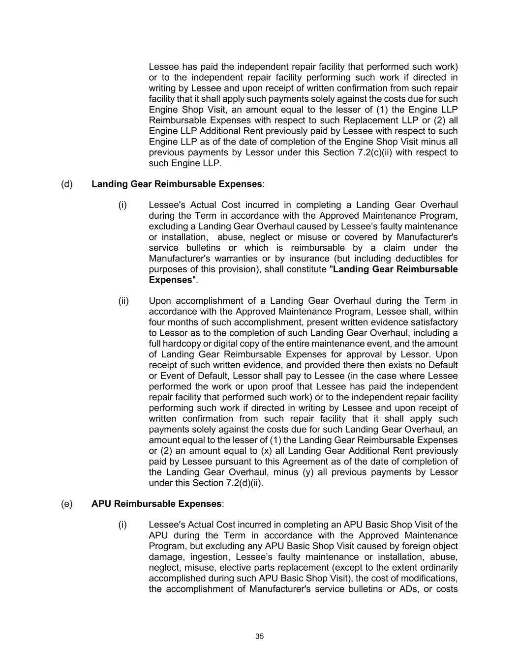 35 Lessee has paid the independent repair facility that performed such work) or to the independent repair facility performing such work if directed in writing by Lessee and upon receipt of written confirmation from such repair facility that it shall apply such payments solely against the costs due for such Engine Shop Visit, an amount equal to the lesser of (1) the Engine LLP Reimbursable Expenses with respect to such Replacement LLP or (2) all Engine LLP Additional Rent previously paid by Lessee with respect to such Engine LLP as of the date of completion of the Engine Shop Visit minus all previous payments by Lessor under this Section 7.2(c)(ii) with respect to such Engine LLP. (d) Landing Gear Reimbursable Expenses: (i) Lessee's Actual Cost incurred in completing a Landing Gear Overhaul during the Term in accordance with the Approved Maintenance Program, excluding a Landing Gear Overhaul caused by Lessee’s faulty maintenance or installation, abuse, neglect or misuse or covered by Manufacturer's service bulletins or which is reimbursable by a claim under the Manufacturer's warranties or by insurance (but including deductibles for purposes of this provision), shall constitute "Landing Gear Reimbursable Expenses". (ii) Upon accomplishment of a Landing Gear Overhaul during the Term in accordance with the Approved Maintenance Program, Lessee shall, within four months of such accomplishment, present written evidence satisfactory to Lessor as to the completion of such Landing Gear Overhaul, including a full hardcopy or digital copy of the entire maintenance event, and the amount of Landing Gear Reimbursable Expenses for approval by Lessor. Upon receipt of such written evidence, and provided there then exists no Default or Event of Default, Lessor shall pay to Lessee (in the case where Lessee performed the work or upon proof that Lessee has paid the independent repair facility that performed such work) or to the independent repair facility performing such work if directed in writing by Lessee and upon receipt of written confirmation from such repair facility that it shall apply such payments solely against the costs due for such Landing Gear Overhaul, an amount equal to the lesser of (1) the Landing Gear Reimbursable Expenses or (2) an amount equal to (x) all Landing Gear Additional Rent previously paid by Lessee pursuant to this Agreement as of the date of completion of the Landing Gear Overhaul, minus (y) all previous payments by Lessor under this Section 7.2(d)(ii). (e) APU Reimbursable Expenses: (i) Lessee's Actual Cost incurred in completing an APU Basic Shop Visit of the APU during the Term in accordance with the Approved Maintenance Program, but excluding any APU Basic Shop Visit caused by foreign object damage, ingestion, Lessee’s faulty maintenance or installation, abuse, neglect, misuse, elective parts replacement (except to the extent ordinarily accomplished during such APU Basic Shop Visit), the cost of modifications, the accomplishment of Manufacturer's service bulletins or ADs, or costs