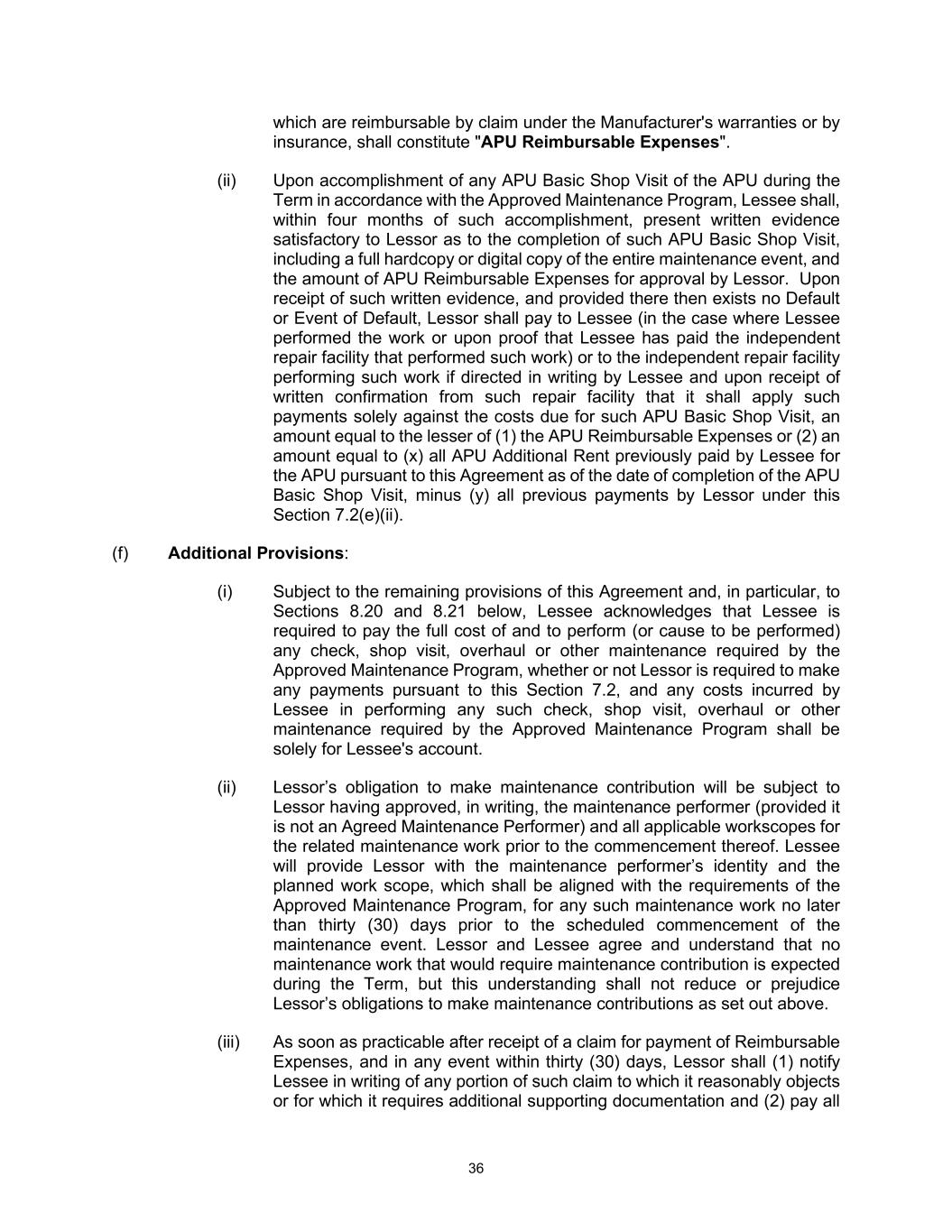 36 which are reimbursable by claim under the Manufacturer's warranties or by insurance, shall constitute "APU Reimbursable Expenses". (ii) Upon accomplishment of any APU Basic Shop Visit of the APU during the Term in accordance with the Approved Maintenance Program, Lessee shall, within four months of such accomplishment, present written evidence satisfactory to Lessor as to the completion of such APU Basic Shop Visit, including a full hardcopy or digital copy of the entire maintenance event, and the amount of APU Reimbursable Expenses for approval by Lessor. Upon receipt of such written evidence, and provided there then exists no Default or Event of Default, Lessor shall pay to Lessee (in the case where Lessee performed the work or upon proof that Lessee has paid the independent repair facility that performed such work) or to the independent repair facility performing such work if directed in writing by Lessee and upon receipt of written confirmation from such repair facility that it shall apply such payments solely against the costs due for such APU Basic Shop Visit, an amount equal to the lesser of (1) the APU Reimbursable Expenses or (2) an amount equal to (x) all APU Additional Rent previously paid by Lessee for the APU pursuant to this Agreement as of the date of completion of the APU Basic Shop Visit, minus (y) all previous payments by Lessor under this Section 7.2(e)(ii). (f) Additional Provisions: (i) Subject to the remaining provisions of this Agreement and, in particular, to Sections 8.20 and 8.21 below, Lessee acknowledges that Lessee is required to pay the full cost of and to perform (or cause to be performed) any check, shop visit, overhaul or other maintenance required by the Approved Maintenance Program, whether or not Lessor is required to make any payments pursuant to this Section 7.2, and any costs incurred by Lessee in performing any such check, shop visit, overhaul or other maintenance required by the Approved Maintenance Program shall be solely for Lessee's account. (ii) Lessor’s obligation to make maintenance contribution will be subject to Lessor having approved, in writing, the maintenance performer (provided it is not an Agreed Maintenance Performer) and all applicable workscopes for the related maintenance work prior to the commencement thereof. Lessee will provide Lessor with the maintenance performer’s identity and the planned work scope, which shall be aligned with the requirements of the Approved Maintenance Program, for any such maintenance work no later than thirty (30) days prior to the scheduled commencement of the maintenance event. Lessor and Lessee agree and understand that no maintenance work that would require maintenance contribution is expected during the Term, but this understanding shall not reduce or prejudice Lessor’s obligations to make maintenance contributions as set out above. (iii) As soon as practicable after receipt of a claim for payment of Reimbursable Expenses, and in any event within thirty (30) days, Lessor shall (1) notify Lessee in writing of any portion of such claim to which it reasonably objects or for which it requires additional supporting documentation and (2) pay all