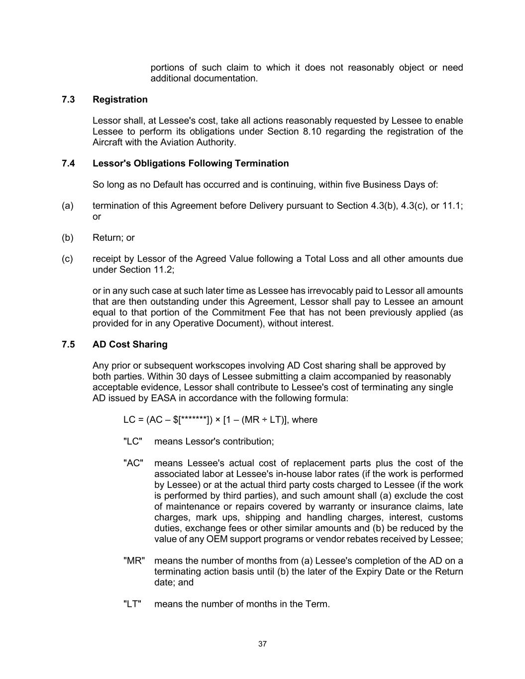 37 portions of such claim to which it does not reasonably object or need additional documentation. 7.3 Registration Lessor shall, at Lessee's cost, take all actions reasonably requested by Lessee to enable Lessee to perform its obligations under Section 8.10 regarding the registration of the Aircraft with the Aviation Authority. 7.4 Lessor's Obligations Following Termination So long as no Default has occurred and is continuing, within five Business Days of: (a) termination of this Agreement before Delivery pursuant to Section 4.3(b), 4.3(c), or 11.1; or (b) Return; or (c) receipt by Lessor of the Agreed Value following a Total Loss and all other amounts due under Section 11.2; or in any such case at such later time as Lessee has irrevocably paid to Lessor all amounts that are then outstanding under this Agreement, Lessor shall pay to Lessee an amount equal to that portion of the Commitment Fee that has not been previously applied (as provided for in any Operative Document), without interest. 7.5 AD Cost Sharing Any prior or subsequent workscopes involving AD Cost sharing shall be approved by both parties. Within 30 days of Lessee submitting a claim accompanied by reasonably acceptable evidence, Lessor shall contribute to Lessee's cost of terminating any single AD issued by EASA in accordance with the following formula: LC = (AC – $[*******]) × [1 – (MR ÷ LT)], where "LC" means Lessor's contribution; "AC" means Lessee's actual cost of replacement parts plus the cost of the associated labor at Lessee's in-house labor rates (if the work is performed by Lessee) or at the actual third party costs charged to Lessee (if the work is performed by third parties), and such amount shall (a) exclude the cost of maintenance or repairs covered by warranty or insurance claims, late charges, mark ups, shipping and handling charges, interest, customs duties, exchange fees or other similar amounts and (b) be reduced by the value of any OEM support programs or vendor rebates received by Lessee; "MR" means the number of months from (a) Lessee's completion of the AD on a terminating action basis until (b) the later of the Expiry Date or the Return date; and "LT" means the number of months in the Term.