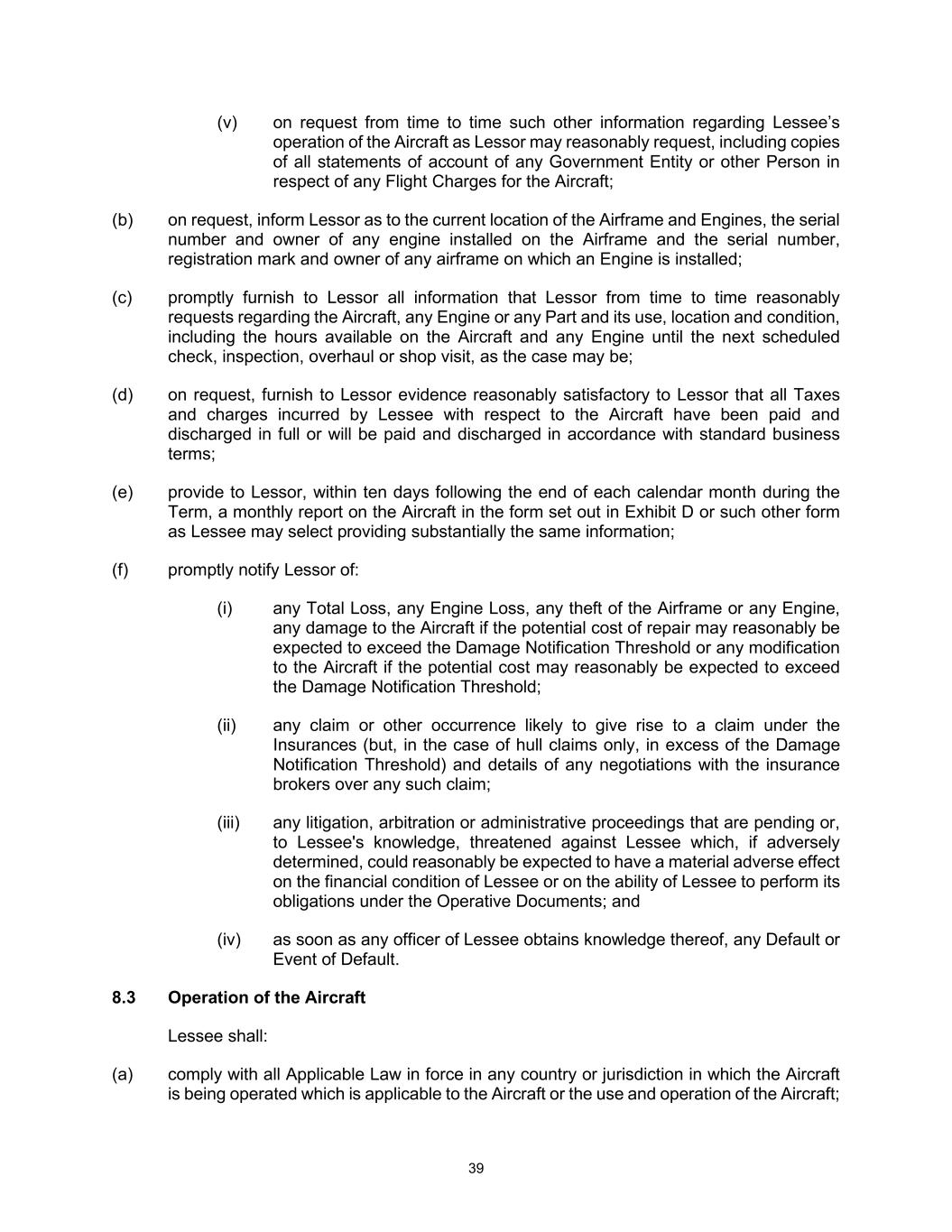 39 (v) on request from time to time such other information regarding Lessee’s operation of the Aircraft as Lessor may reasonably request, including copies of all statements of account of any Government Entity or other Person in respect of any Flight Charges for the Aircraft; (b) on request, inform Lessor as to the current location of the Airframe and Engines, the serial number and owner of any engine installed on the Airframe and the serial number, registration mark and owner of any airframe on which an Engine is installed; (c) promptly furnish to Lessor all information that Lessor from time to time reasonably requests regarding the Aircraft, any Engine or any Part and its use, location and condition, including the hours available on the Aircraft and any Engine until the next scheduled check, inspection, overhaul or shop visit, as the case may be; (d) on request, furnish to Lessor evidence reasonably satisfactory to Lessor that all Taxes and charges incurred by Lessee with respect to the Aircraft have been paid and discharged in full or will be paid and discharged in accordance with standard business terms; (e) provide to Lessor, within ten days following the end of each calendar month during the Term, a monthly report on the Aircraft in the form set out in Exhibit D or such other form as Lessee may select providing substantially the same information; (f) promptly notify Lessor of: (i) any Total Loss, any Engine Loss, any theft of the Airframe or any Engine, any damage to the Aircraft if the potential cost of repair may reasonably be expected to exceed the Damage Notification Threshold or any modification to the Aircraft if the potential cost may reasonably be expected to exceed the Damage Notification Threshold; (ii) any claim or other occurrence likely to give rise to a claim under the Insurances (but, in the case of hull claims only, in excess of the Damage Notification Threshold) and details of any negotiations with the insurance brokers over any such claim; (iii) any litigation, arbitration or administrative proceedings that are pending or, to Lessee's knowledge, threatened against Lessee which, if adversely determined, could reasonably be expected to have a material adverse effect on the financial condition of Lessee or on the ability of Lessee to perform its obligations under the Operative Documents; and (iv) as soon as any officer of Lessee obtains knowledge thereof, any Default or Event of Default. 8.3 Operation of the Aircraft Lessee shall: (a) comply with all Applicable Law in force in any country or jurisdiction in which the Aircraft is being operated which is applicable to the Aircraft or the use and operation of the Aircraft;