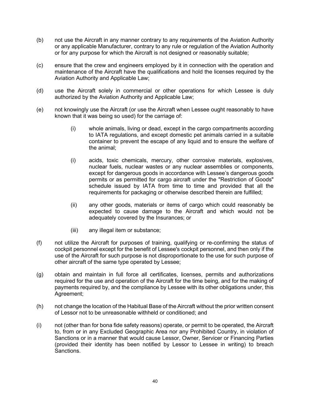 40 (b) not use the Aircraft in any manner contrary to any requirements of the Aviation Authority or any applicable Manufacturer, contrary to any rule or regulation of the Aviation Authority or for any purpose for which the Aircraft is not designed or reasonably suitable; (c) ensure that the crew and engineers employed by it in connection with the operation and maintenance of the Aircraft have the qualifications and hold the licenses required by the Aviation Authority and Applicable Law; (d) use the Aircraft solely in commercial or other operations for which Lessee is duly authorized by the Aviation Authority and Applicable Law; (e) not knowingly use the Aircraft (or use the Aircraft when Lessee ought reasonably to have known that it was being so used) for the carriage of: (i) whole animals, living or dead, except in the cargo compartments according to IATA regulations, and except domestic pet animals carried in a suitable container to prevent the escape of any liquid and to ensure the welfare of the animal; (i) acids, toxic chemicals, mercury, other corrosive materials, explosives, nuclear fuels, nuclear wastes or any nuclear assemblies or components, except for dangerous goods in accordance with Lessee’s dangerous goods permits or as permitted for cargo aircraft under the "Restriction of Goods" schedule issued by IATA from time to time and provided that all the requirements for packaging or otherwise described therein are fulfilled; (ii) any other goods, materials or items of cargo which could reasonably be expected to cause damage to the Aircraft and which would not be adequately covered by the Insurances; or (iii) any illegal item or substance; (f) not utilize the Aircraft for purposes of training, qualifying or re-confirming the status of cockpit personnel except for the benefit of Lessee's cockpit personnel, and then only if the use of the Aircraft for such purpose is not disproportionate to the use for such purpose of other aircraft of the same type operated by Lessee; (g) obtain and maintain in full force all certificates, licenses, permits and authorizations required for the use and operation of the Aircraft for the time being, and for the making of payments required by, and the compliance by Lessee with its other obligations under, this Agreement; (h) not change the location of the Habitual Base of the Aircraft without the prior written consent of Lessor not to be unreasonable withheld or conditioned; and (i) not (other than for bona fide safety reasons) operate, or permit to be operated, the Aircraft to, from or in any Excluded Geographic Area nor any Prohibited Country, in violation of Sanctions or in a manner that would cause Lessor, Owner, Servicer or Financing Parties (provided their identity has been notified by Lessor to Lessee in writing) to breach Sanctions.