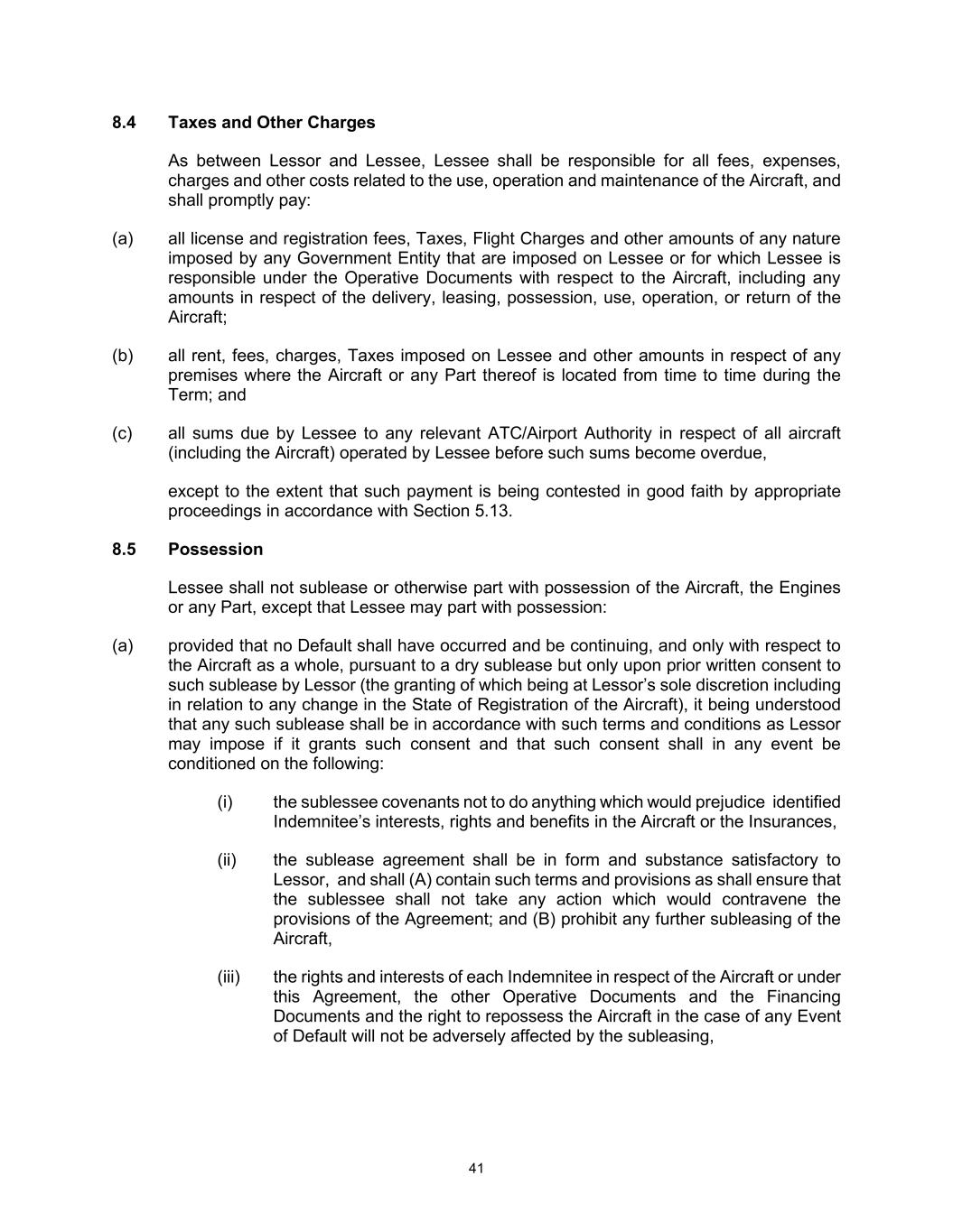 41 8.4 Taxes and Other Charges As between Lessor and Lessee, Lessee shall be responsible for all fees, expenses, charges and other costs related to the use, operation and maintenance of the Aircraft, and shall promptly pay: (a) all license and registration fees, Taxes, Flight Charges and other amounts of any nature imposed by any Government Entity that are imposed on Lessee or for which Lessee is responsible under the Operative Documents with respect to the Aircraft, including any amounts in respect of the delivery, leasing, possession, use, operation, or return of the Aircraft; (b) all rent, fees, charges, Taxes imposed on Lessee and other amounts in respect of any premises where the Aircraft or any Part thereof is located from time to time during the Term; and (c) all sums due by Lessee to any relevant ATC/Airport Authority in respect of all aircraft (including the Aircraft) operated by Lessee before such sums become overdue, except to the extent that such payment is being contested in good faith by appropriate proceedings in accordance with Section 5.13. 8.5 Possession Lessee shall not sublease or otherwise part with possession of the Aircraft, the Engines or any Part, except that Lessee may part with possession: (a) provided that no Default shall have occurred and be continuing, and only with respect to the Aircraft as a whole, pursuant to a dry sublease but only upon prior written consent to such sublease by Lessor (the granting of which being at Lessor’s sole discretion including in relation to any change in the State of Registration of the Aircraft), it being understood that any such sublease shall be in accordance with such terms and conditions as Lessor may impose if it grants such consent and that such consent shall in any event be conditioned on the following: (i) the sublessee covenants not to do anything which would prejudice identified Indemnitee’s interests, rights and benefits in the Aircraft or the Insurances, (ii) the sublease agreement shall be in form and substance satisfactory to Lessor, and shall (A) contain such terms and provisions as shall ensure that the sublessee shall not take any action which would contravene the provisions of the Agreement; and (B) prohibit any further subleasing of the Aircraft, (iii) the rights and interests of each Indemnitee in respect of the Aircraft or under this Agreement, the other Operative Documents and the Financing Documents and the right to repossess the Aircraft in the case of any Event of Default will not be adversely affected by the subleasing,
