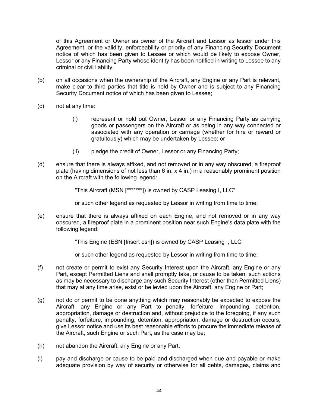 44 of this Agreement or Owner as owner of the Aircraft and Lessor as lessor under this Agreement, or the validity, enforceability or priority of any Financing Security Document notice of which has been given to Lessee or which would be likely to expose Owner, Lessor or any Financing Party whose identity has been notified in writing to Lessee to any criminal or civil liability; (b) on all occasions when the ownership of the Aircraft, any Engine or any Part is relevant, make clear to third parties that title is held by Owner and is subject to any Financing Security Document notice of which has been given to Lessee; (c) not at any time: (i) represent or hold out Owner, Lessor or any Financing Party as carrying goods or passengers on the Aircraft or as being in any way connected or associated with any operation or carriage (whether for hire or reward or gratuitously) which may be undertaken by Lessee; or (ii) pledge the credit of Owner, Lessor or any Financing Party; (d) ensure that there is always affixed, and not removed or in any way obscured, a fireproof plate (having dimensions of not less than 6 in. x 4 in.) in a reasonably prominent position on the Aircraft with the following legend: "This Aircraft (MSN [*******]) is owned by CASP Leasing I, LLC" or such other legend as requested by Lessor in writing from time to time; (e) ensure that there is always affixed on each Engine, and not removed or in any way obscured, a fireproof plate in a prominent position near such Engine's data plate with the following legend: "This Engine (ESN [Insert esn]) is owned by CASP Leasing I, LLC" or such other legend as requested by Lessor in writing from time to time; (f) not create or permit to exist any Security Interest upon the Aircraft, any Engine or any Part, except Permitted Liens and shall promptly take, or cause to be taken, such actions as may be necessary to discharge any such Security Interest (other than Permitted Liens) that may at any time arise, exist or be levied upon the Aircraft, any Engine or Part; (g) not do or permit to be done anything which may reasonably be expected to expose the Aircraft, any Engine or any Part to penalty, forfeiture, impounding, detention, appropriation, damage or destruction and, without prejudice to the foregoing, if any such penalty, forfeiture, impounding, detention, appropriation, damage or destruction occurs, give Lessor notice and use its best reasonable efforts to procure the immediate release of the Aircraft, such Engine or such Part, as the case may be; (h) not abandon the Aircraft, any Engine or any Part; (i) pay and discharge or cause to be paid and discharged when due and payable or make adequate provision by way of security or otherwise for all debts, damages, claims and