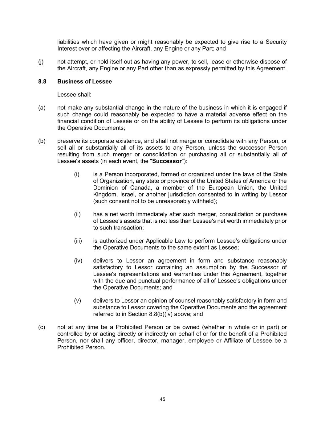 45 liabilities which have given or might reasonably be expected to give rise to a Security Interest over or affecting the Aircraft, any Engine or any Part; and (j) not attempt, or hold itself out as having any power, to sell, lease or otherwise dispose of the Aircraft, any Engine or any Part other than as expressly permitted by this Agreement. 8.8 Business of Lessee Lessee shall: (a) not make any substantial change in the nature of the business in which it is engaged if such change could reasonably be expected to have a material adverse effect on the financial condition of Lessee or on the ability of Lessee to perform its obligations under the Operative Documents; (b) preserve its corporate existence, and shall not merge or consolidate with any Person, or sell all or substantially all of its assets to any Person, unless the successor Person resulting from such merger or consolidation or purchasing all or substantially all of Lessee's assets (in each event, the "Successor"): (i) is a Person incorporated, formed or organized under the laws of the State of Organization, any state or province of the United States of America or the Dominion of Canada, a member of the European Union, the United Kingdom, Israel, or another jurisdiction consented to in writing by Lessor (such consent not to be unreasonably withheld); (ii) has a net worth immediately after such merger, consolidation or purchase of Lessee's assets that is not less than Lessee's net worth immediately prior to such transaction; (iii) is authorized under Applicable Law to perform Lessee's obligations under the Operative Documents to the same extent as Lessee; (iv) delivers to Lessor an agreement in form and substance reasonably satisfactory to Lessor containing an assumption by the Successor of Lessee's representations and warranties under this Agreement, together with the due and punctual performance of all of Lessee's obligations under the Operative Documents; and (v) delivers to Lessor an opinion of counsel reasonably satisfactory in form and substance to Lessor covering the Operative Documents and the agreement referred to in Section 8.8(b)(iv) above; and (c) not at any time be a Prohibited Person or be owned (whether in whole or in part) or controlled by or acting directly or indirectly on behalf of or for the benefit of a Prohibited Person, nor shall any officer, director, manager, employee or Affiliate of Lessee be a Prohibited Person.