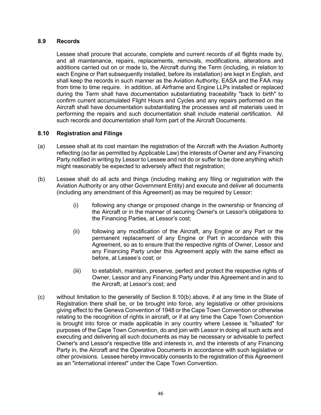 46 8.9 Records Lessee shall procure that accurate, complete and current records of all flights made by, and all maintenance, repairs, replacements, removals, modifications, alterations and additions carried out on or made to, the Aircraft during the Term (including, in relation to each Engine or Part subsequently installed, before its installation) are kept in English, and shall keep the records in such manner as the Aviation Authority, EASA and the FAA may from time to time require. In addition, all Airframe and Engine LLPs installed or replaced during the Term shall have documentation substantiating traceability "back to birth" to confirm current accumulated Flight Hours and Cycles and any repairs performed on the Aircraft shall have documentation substantiating the processes and all materials used in performing the repairs and such documentation shall include material certification. All such records and documentation shall form part of the Aircraft Documents. 8.10 Registration and Filings (a) Lessee shall at its cost maintain the registration of the Aircraft with the Aviation Authority reflecting (so far as permitted by Applicable Law) the interests of Owner and any Financing Party notified in writing by Lessor to Lessee and not do or suffer to be done anything which might reasonably be expected to adversely affect that registration; (b) Lessee shall do all acts and things (including making any filing or registration with the Aviation Authority or any other Government Entity) and execute and deliver all documents (including any amendment of this Agreement) as may be required by Lessor: (i) following any change or proposed change in the ownership or financing of the Aircraft or in the manner of securing Owner's or Lessor's obligations to the Financing Parties, at Lessor’s cost; (ii) following any modification of the Aircraft, any Engine or any Part or the permanent replacement of any Engine or Part in accordance with this Agreement, so as to ensure that the respective rights of Owner, Lessor and any Financing Party under this Agreement apply with the same effect as before, at Lessee’s cost; or (iii) to establish, maintain, preserve, perfect and protect the respective rights of Owner, Lessor and any Financing Party under this Agreement and in and to the Aircraft, at Lessor’s cost; and (c) without limitation to the generality of Section 8.10(b) above, if at any time in the State of Registration there shall be, or be brought into force, any legislative or other provisions giving effect to the Geneva Convention of 1948 or the Cape Town Convention or otherwise relating to the recognition of rights in aircraft, or if at any time the Cape Town Convention is brought into force or made applicable in any country where Lessee is "situated" for purposes of the Cape Town Convention, do and join with Lessor in doing all such acts and executing and delivering all such documents as may be necessary or advisable to perfect Owner's and Lessor's respective title and interests in, and the interests of any Financing Party in, the Aircraft and the Operative Documents in accordance with such legislative or other provisions. Lessee hereby irrevocably consents to the registration of this Agreement as an "international interest" under the Cape Town Convention.