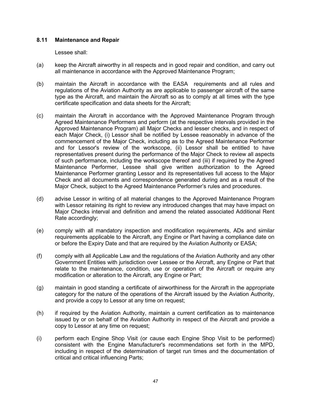 47 8.11 Maintenance and Repair Lessee shall: (a) keep the Aircraft airworthy in all respects and in good repair and condition, and carry out all maintenance in accordance with the Approved Maintenance Program; (b) maintain the Aircraft in accordance with the EASA requirements and all rules and regulations of the Aviation Authority as are applicable to passenger aircraft of the same type as the Aircraft, and maintain the Aircraft so as to comply at all times with the type certificate specification and data sheets for the Aircraft; (c) maintain the Aircraft in accordance with the Approved Maintenance Program through Agreed Maintenance Performers and perform (at the respective intervals provided in the Approved Maintenance Program) all Major Checks and lesser checks, and in respect of each Major Check, (i) Lessor shall be notified by Lessee reasonably in advance of the commencement of the Major Check, including as to the Agreed Maintenance Performer and for Lessor's review of the workscope, (ii) Lessor shall be entitled to have representatives present during the performance of the Major Check to review all aspects of such performance, including the workscope thereof and (iii) if required by the Agreed Maintenance Performer, Lessee shall give written authorization to the Agreed Maintenance Performer granting Lessor and its representatives full access to the Major Check and all documents and correspondence generated during and as a result of the Major Check, subject to the Agreed Maintenance Performer’s rules and procedures. (d) advise Lessor in writing of all material changes to the Approved Maintenance Program with Lessor retaining its right to review any introduced changes that may have impact on Major Checks interval and definition and amend the related associated Additional Rent Rate accordingly; (e) comply with all mandatory inspection and modification requirements, ADs and similar requirements applicable to the Aircraft, any Engine or Part having a compliance date on or before the Expiry Date and that are required by the Aviation Authority or EASA; (f) comply with all Applicable Law and the regulations of the Aviation Authority and any other Government Entities with jurisdiction over Lessee or the Aircraft, any Engine or Part that relate to the maintenance, condition, use or operation of the Aircraft or require any modification or alteration to the Aircraft, any Engine or Part; (g) maintain in good standing a certificate of airworthiness for the Aircraft in the appropriate category for the nature of the operations of the Aircraft issued by the Aviation Authority, and provide a copy to Lessor at any time on request; (h) if required by the Aviation Authority, maintain a current certification as to maintenance issued by or on behalf of the Aviation Authority in respect of the Aircraft and provide a copy to Lessor at any time on request; (i) perform each Engine Shop Visit (or cause each Engine Shop Visit to be performed) consistent with the Engine Manufacturer's recommendations set forth in the MPD, including in respect of the determination of target run times and the documentation of critical and critical influencing Parts;