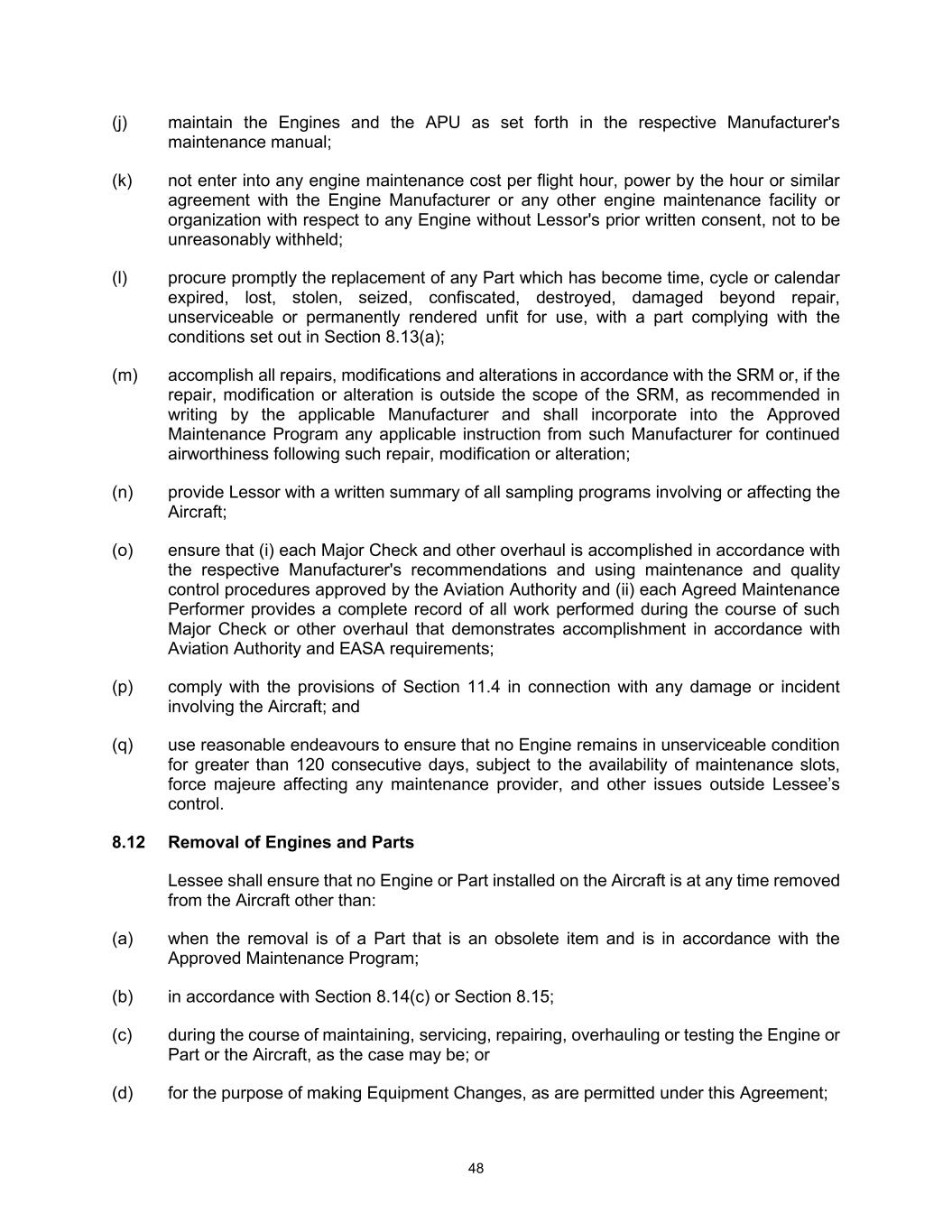 48 (j) maintain the Engines and the APU as set forth in the respective Manufacturer's maintenance manual; (k) not enter into any engine maintenance cost per flight hour, power by the hour or similar agreement with the Engine Manufacturer or any other engine maintenance facility or organization with respect to any Engine without Lessor's prior written consent, not to be unreasonably withheld; (l) procure promptly the replacement of any Part which has become time, cycle or calendar expired, lost, stolen, seized, confiscated, destroyed, damaged beyond repair, unserviceable or permanently rendered unfit for use, with a part complying with the conditions set out in Section 8.13(a); (m) accomplish all repairs, modifications and alterations in accordance with the SRM or, if the repair, modification or alteration is outside the scope of the SRM, as recommended in writing by the applicable Manufacturer and shall incorporate into the Approved Maintenance Program any applicable instruction from such Manufacturer for continued airworthiness following such repair, modification or alteration; (n) provide Lessor with a written summary of all sampling programs involving or affecting the Aircraft; (o) ensure that (i) each Major Check and other overhaul is accomplished in accordance with the respective Manufacturer's recommendations and using maintenance and quality control procedures approved by the Aviation Authority and (ii) each Agreed Maintenance Performer provides a complete record of all work performed during the course of such Major Check or other overhaul that demonstrates accomplishment in accordance with Aviation Authority and EASA requirements; (p) comply with the provisions of Section 11.4 in connection with any damage or incident involving the Aircraft; and (q) use reasonable endeavours to ensure that no Engine remains in unserviceable condition for greater than 120 consecutive days, subject to the availability of maintenance slots, force majeure affecting any maintenance provider, and other issues outside Lessee’s control. 8.12 Removal of Engines and Parts Lessee shall ensure that no Engine or Part installed on the Aircraft is at any time removed from the Aircraft other than: (a) when the removal is of a Part that is an obsolete item and is in accordance with the Approved Maintenance Program; (b) in accordance with Section 8.14(c) or Section 8.15; (c) during the course of maintaining, servicing, repairing, overhauling or testing the Engine or Part or the Aircraft, as the case may be; or (d) for the purpose of making Equipment Changes, as are permitted under this Agreement;