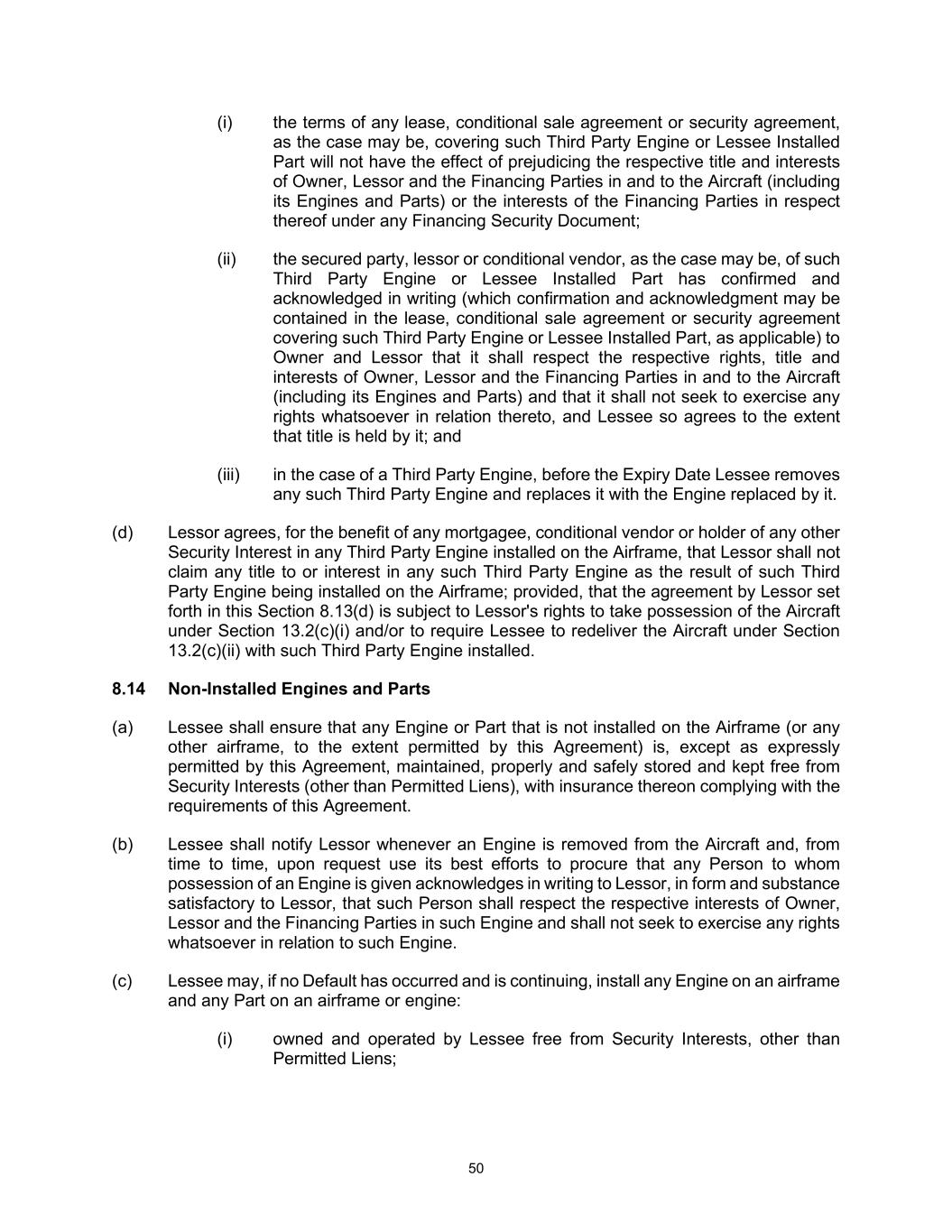50 (i) the terms of any lease, conditional sale agreement or security agreement, as the case may be, covering such Third Party Engine or Lessee Installed Part will not have the effect of prejudicing the respective title and interests of Owner, Lessor and the Financing Parties in and to the Aircraft (including its Engines and Parts) or the interests of the Financing Parties in respect thereof under any Financing Security Document; (ii) the secured party, lessor or conditional vendor, as the case may be, of such Third Party Engine or Lessee Installed Part has confirmed and acknowledged in writing (which confirmation and acknowledgment may be contained in the lease, conditional sale agreement or security agreement covering such Third Party Engine or Lessee Installed Part, as applicable) to Owner and Lessor that it shall respect the respective rights, title and interests of Owner, Lessor and the Financing Parties in and to the Aircraft (including its Engines and Parts) and that it shall not seek to exercise any rights whatsoever in relation thereto, and Lessee so agrees to the extent that title is held by it; and (iii) in the case of a Third Party Engine, before the Expiry Date Lessee removes any such Third Party Engine and replaces it with the Engine replaced by it. (d) Lessor agrees, for the benefit of any mortgagee, conditional vendor or holder of any other Security Interest in any Third Party Engine installed on the Airframe, that Lessor shall not claim any title to or interest in any such Third Party Engine as the result of such Third Party Engine being installed on the Airframe; provided, that the agreement by Lessor set forth in this Section 8.13(d) is subject to Lessor's rights to take possession of the Aircraft under Section 13.2(c)(i) and/or to require Lessee to redeliver the Aircraft under Section 13.2(c)(ii) with such Third Party Engine installed. 8.14 Non-Installed Engines and Parts (a) Lessee shall ensure that any Engine or Part that is not installed on the Airframe (or any other airframe, to the extent permitted by this Agreement) is, except as expressly permitted by this Agreement, maintained, properly and safely stored and kept free from Security Interests (other than Permitted Liens), with insurance thereon complying with the requirements of this Agreement. (b) Lessee shall notify Lessor whenever an Engine is removed from the Aircraft and, from time to time, upon request use its best efforts to procure that any Person to whom possession of an Engine is given acknowledges in writing to Lessor, in form and substance satisfactory to Lessor, that such Person shall respect the respective interests of Owner, Lessor and the Financing Parties in such Engine and shall not seek to exercise any rights whatsoever in relation to such Engine. (c) Lessee may, if no Default has occurred and is continuing, install any Engine on an airframe and any Part on an airframe or engine: (i) owned and operated by Lessee free from Security Interests, other than Permitted Liens;
