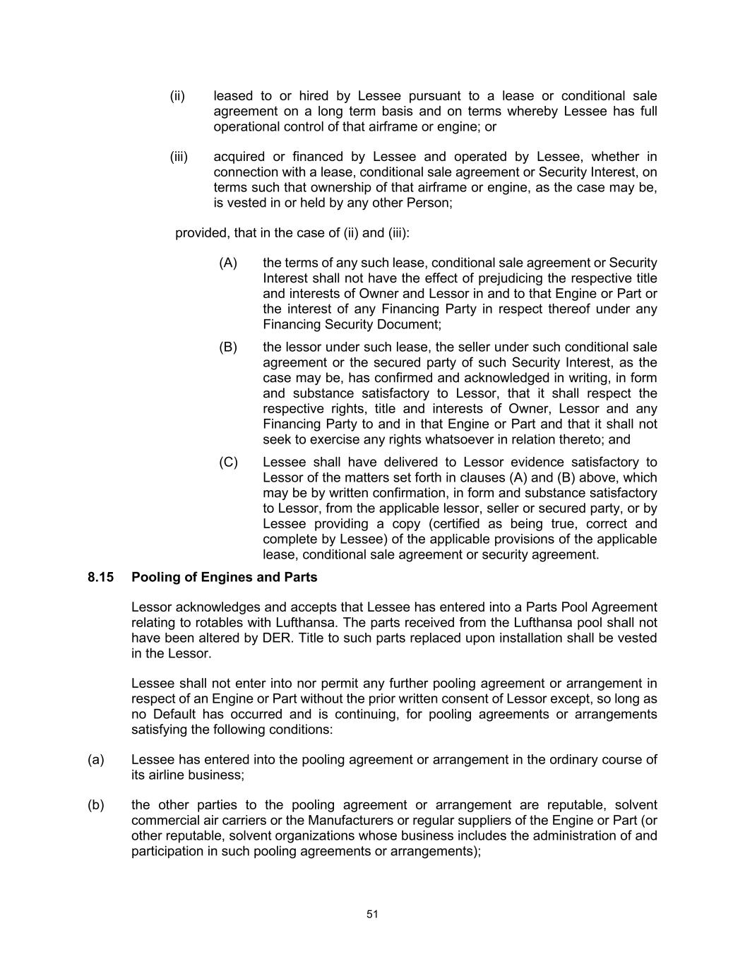 51 (ii) leased to or hired by Lessee pursuant to a lease or conditional sale agreement on a long term basis and on terms whereby Lessee has full operational control of that airframe or engine; or (iii) acquired or financed by Lessee and operated by Lessee, whether in connection with a lease, conditional sale agreement or Security Interest, on terms such that ownership of that airframe or engine, as the case may be, is vested in or held by any other Person; provided, that in the case of (ii) and (iii): (A) the terms of any such lease, conditional sale agreement or Security Interest shall not have the effect of prejudicing the respective title and interests of Owner and Lessor in and to that Engine or Part or the interest of any Financing Party in respect thereof under any Financing Security Document; (B) the lessor under such lease, the seller under such conditional sale agreement or the secured party of such Security Interest, as the case may be, has confirmed and acknowledged in writing, in form and substance satisfactory to Lessor, that it shall respect the respective rights, title and interests of Owner, Lessor and any Financing Party to and in that Engine or Part and that it shall not seek to exercise any rights whatsoever in relation thereto; and (C) Lessee shall have delivered to Lessor evidence satisfactory to Lessor of the matters set forth in clauses (A) and (B) above, which may be by written confirmation, in form and substance satisfactory to Lessor, from the applicable lessor, seller or secured party, or by Lessee providing a copy (certified as being true, correct and complete by Lessee) of the applicable provisions of the applicable lease, conditional sale agreement or security agreement. 8.15 Pooling of Engines and Parts Lessor acknowledges and accepts that Lessee has entered into a Parts Pool Agreement relating to rotables with Lufthansa. The parts received from the Lufthansa pool shall not have been altered by DER. Title to such parts replaced upon installation shall be vested in the Lessor. Lessee shall not enter into nor permit any further pooling agreement or arrangement in respect of an Engine or Part without the prior written consent of Lessor except, so long as no Default has occurred and is continuing, for pooling agreements or arrangements satisfying the following conditions: (a) Lessee has entered into the pooling agreement or arrangement in the ordinary course of its airline business; (b) the other parties to the pooling agreement or arrangement are reputable, solvent commercial air carriers or the Manufacturers or regular suppliers of the Engine or Part (or other reputable, solvent organizations whose business includes the administration of and participation in such pooling agreements or arrangements);