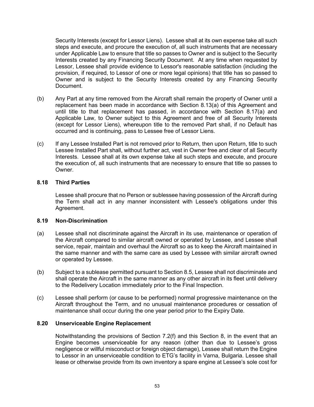 53 Security Interests (except for Lessor Liens). Lessee shall at its own expense take all such steps and execute, and procure the execution of, all such instruments that are necessary under Applicable Law to ensure that title so passes to Owner and is subject to the Security Interests created by any Financing Security Document. At any time when requested by Lessor, Lessee shall provide evidence to Lessor's reasonable satisfaction (including the provision, if required, to Lessor of one or more legal opinions) that title has so passed to Owner and is subject to the Security Interests created by any Financing Security Document. (b) Any Part at any time removed from the Aircraft shall remain the property of Owner until a replacement has been made in accordance with Section 8.13(a) of this Agreement and until title to that replacement has passed, in accordance with Section 8.17(a) and Applicable Law, to Owner subject to this Agreement and free of all Security Interests (except for Lessor Liens), whereupon title to the removed Part shall, if no Default has occurred and is continuing, pass to Lessee free of Lessor Liens. (c) If any Lessee Installed Part is not removed prior to Return, then upon Return, title to such Lessee Installed Part shall, without further act, vest in Owner free and clear of all Security Interests. Lessee shall at its own expense take all such steps and execute, and procure the execution of, all such instruments that are necessary to ensure that title so passes to Owner. 8.18 Third Parties Lessee shall procure that no Person or sublessee having possession of the Aircraft during the Term shall act in any manner inconsistent with Lessee's obligations under this Agreement. 8.19 Non-Discrimination (a) Lessee shall not discriminate against the Aircraft in its use, maintenance or operation of the Aircraft compared to similar aircraft owned or operated by Lessee, and Lessee shall service, repair, maintain and overhaul the Aircraft so as to keep the Aircraft maintained in the same manner and with the same care as used by Lessee with similar aircraft owned or operated by Lessee. (b) Subject to a sublease permitted pursuant to Section 8.5, Lessee shall not discriminate and shall operate the Aircraft in the same manner as any other aircraft in its fleet until delivery to the Redelivery Location immediately prior to the Final Inspection. (c) Lessee shall perform (or cause to be performed) normal progressive maintenance on the Aircraft throughout the Term, and no unusual maintenance procedures or cessation of maintenance shall occur during the one year period prior to the Expiry Date. 8.20 Unserviceable Engine Replacement Notwithstanding the provisions of Section 7.2(f) and this Section 8, in the event that an Engine becomes unserviceable for any reason (other than due to Lessee’s gross negligence or willful misconduct or foreign object damage), Lessee shall return the Engine to Lessor in an unserviceable condition to ETG’s facility in Varna, Bulgaria. Lessee shall lease or otherwise provide from its own inventory a spare engine at Lessee’s sole cost for