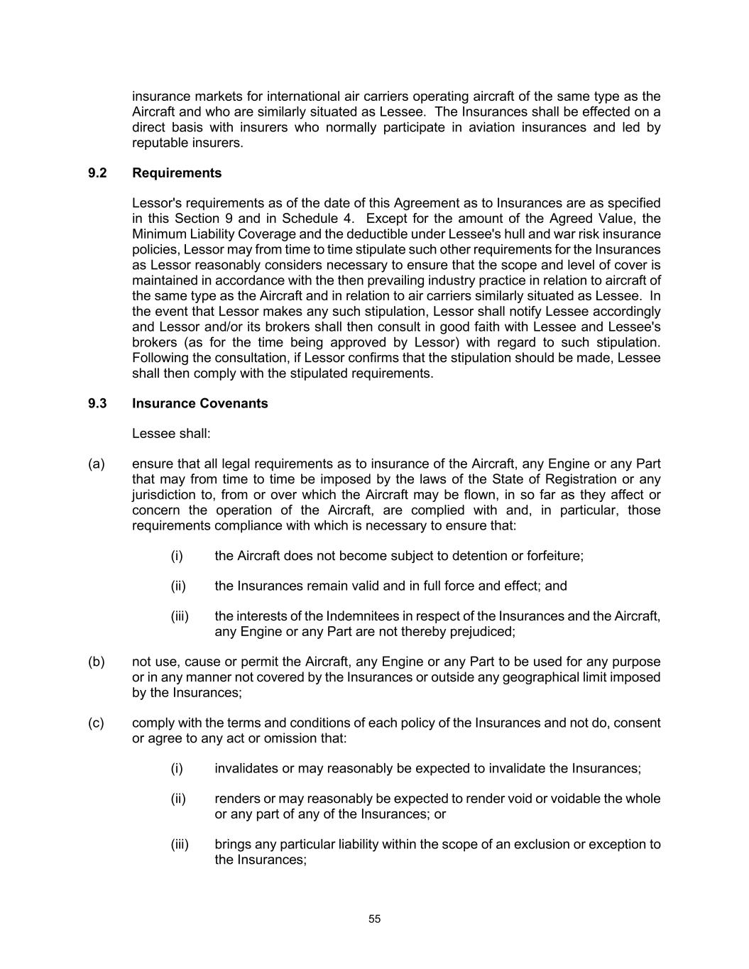 55 insurance markets for international air carriers operating aircraft of the same type as the Aircraft and who are similarly situated as Lessee. The Insurances shall be effected on a direct basis with insurers who normally participate in aviation insurances and led by reputable insurers. 9.2 Requirements Lessor's requirements as of the date of this Agreement as to Insurances are as specified in this Section 9 and in Schedule 4. Except for the amount of the Agreed Value, the Minimum Liability Coverage and the deductible under Lessee's hull and war risk insurance policies, Lessor may from time to time stipulate such other requirements for the Insurances as Lessor reasonably considers necessary to ensure that the scope and level of cover is maintained in accordance with the then prevailing industry practice in relation to aircraft of the same type as the Aircraft and in relation to air carriers similarly situated as Lessee. In the event that Lessor makes any such stipulation, Lessor shall notify Lessee accordingly and Lessor and/or its brokers shall then consult in good faith with Lessee and Lessee's brokers (as for the time being approved by Lessor) with regard to such stipulation. Following the consultation, if Lessor confirms that the stipulation should be made, Lessee shall then comply with the stipulated requirements. 9.3 Insurance Covenants Lessee shall: (a) ensure that all legal requirements as to insurance of the Aircraft, any Engine or any Part that may from time to time be imposed by the laws of the State of Registration or any jurisdiction to, from or over which the Aircraft may be flown, in so far as they affect or concern the operation of the Aircraft, are complied with and, in particular, those requirements compliance with which is necessary to ensure that: (i) the Aircraft does not become subject to detention or forfeiture; (ii) the Insurances remain valid and in full force and effect; and (iii) the interests of the Indemnitees in respect of the Insurances and the Aircraft, any Engine or any Part are not thereby prejudiced; (b) not use, cause or permit the Aircraft, any Engine or any Part to be used for any purpose or in any manner not covered by the Insurances or outside any geographical limit imposed by the Insurances; (c) comply with the terms and conditions of each policy of the Insurances and not do, consent or agree to any act or omission that: (i) invalidates or may reasonably be expected to invalidate the Insurances; (ii) renders or may reasonably be expected to render void or voidable the whole or any part of any of the Insurances; or (iii) brings any particular liability within the scope of an exclusion or exception to the Insurances;