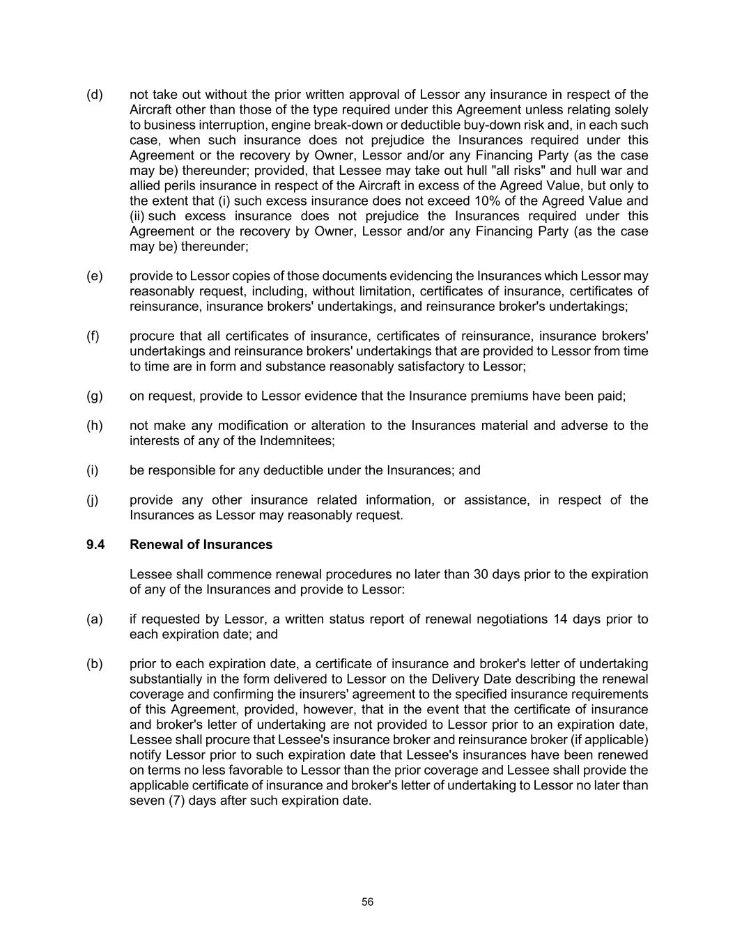 56 (d) not take out without the prior written approval of Lessor any insurance in respect of the Aircraft other than those of the type required under this Agreement unless relating solely to business interruption, engine break-down or deductible buy-down risk and, in each such case, when such insurance does not prejudice the Insurances required under this Agreement or the recovery by Owner, Lessor and/or any Financing Party (as the case may be) thereunder; provided, that Lessee may take out hull "all risks" and hull war and allied perils insurance in respect of the Aircraft in excess of the Agreed Value, but only to the extent that (i) such excess insurance does not exceed 10% of the Agreed Value and (ii) such excess insurance does not prejudice the Insurances required under this Agreement or the recovery by Owner, Lessor and/or any Financing Party (as the case may be) thereunder; (e) provide to Lessor copies of those documents evidencing the Insurances which Lessor may reasonably request, including, without limitation, certificates of insurance, certificates of reinsurance, insurance brokers' undertakings, and reinsurance broker's undertakings; (f) procure that all certificates of insurance, certificates of reinsurance, insurance brokers' undertakings and reinsurance brokers' undertakings that are provided to Lessor from time to time are in form and substance reasonably satisfactory to Lessor; (g) on request, provide to Lessor evidence that the Insurance premiums have been paid; (h) not make any modification or alteration to the Insurances material and adverse to the interests of any of the Indemnitees; (i) be responsible for any deductible under the Insurances; and (j) provide any other insurance related information, or assistance, in respect of the Insurances as Lessor may reasonably request. 9.4 Renewal of Insurances Lessee shall commence renewal procedures no later than 30 days prior to the expiration of any of the Insurances and provide to Lessor: (a) if requested by Lessor, a written status report of renewal negotiations 14 days prior to each expiration date; and (b) prior to each expiration date, a certificate of insurance and broker's letter of undertaking substantially in the form delivered to Lessor on the Delivery Date describing the renewal coverage and confirming the insurers' agreement to the specified insurance requirements of this Agreement, provided, however, that in the event that the certificate of insurance and broker's letter of undertaking are not provided to Lessor prior to an expiration date, Lessee shall procure that Lessee's insurance broker and reinsurance broker (if applicable) notify Lessor prior to such expiration date that Lessee's insurances have been renewed on terms no less favorable to Lessor than the prior coverage and Lessee shall provide the applicable certificate of insurance and broker's letter of undertaking to Lessor no later than seven (7) days after such expiration date.