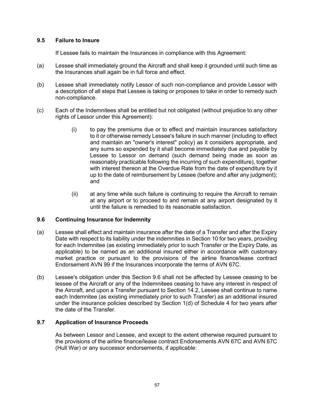 57 9.5 Failure to Insure If Lessee fails to maintain the Insurances in compliance with this Agreement: (a) Lessee shall immediately ground the Aircraft and shall keep it grounded until such time as the Insurances shall again be in full force and effect. (b) Lessee shall immediately notify Lessor of such non-compliance and provide Lessor with a description of all steps that Lessee is taking or proposes to take in order to remedy such non-compliance. (c) Each of the Indemnitees shall be entitled but not obligated (without prejudice to any other rights of Lessor under this Agreement): (i) to pay the premiums due or to effect and maintain insurances satisfactory to it or otherwise remedy Lessee's failure in such manner (including to effect and maintain an "owner's interest" policy) as it considers appropriate, and any sums so expended by it shall become immediately due and payable by Lessee to Lessor on demand (such demand being made as soon as reasonably practicable following the incurring of such expenditure), together with interest thereon at the Overdue Rate from the date of expenditure by it up to the date of reimbursement by Lessee (before and after any judgment); and (ii) at any time while such failure is continuing to require the Aircraft to remain at any airport or to proceed to and remain at any airport designated by it until the failure is remedied to its reasonable satisfaction. 9.6 Continuing Insurance for Indemnity (a) Lessee shall effect and maintain insurance after the date of a Transfer and after the Expiry Date with respect to its liability under the indemnities in Section 10 for two years, providing for each Indemnitee (as existing immediately prior to such Transfer or the Expiry Date, as applicable) to be named as an additional insured either in accordance with customary market practice or pursuant to the provisions of the airline finance/lease contract Endorsement AVN 99 if the Insurances incorporate the terms of AVN 67C. (b) Lessee's obligation under this Section 9.6 shall not be affected by Lessee ceasing to be lessee of the Aircraft or any of the Indemnitees ceasing to have any interest in respect of the Aircraft, and upon a Transfer pursuant to Section 14.2, Lessee shall continue to name each Indemnitee (as existing immediately prior to such Transfer) as an additional insured under the insurance policies described by Section 1(d) of Schedule 4 for two years after the date of the Transfer. 9.7 Application of Insurance Proceeds As between Lessor and Lessee, and except to the extent otherwise required pursuant to the provisions of the airline finance/lease contract Endorsements AVN 67C and AVN 67C (Hull War) or any successor endorsements, if applicable: