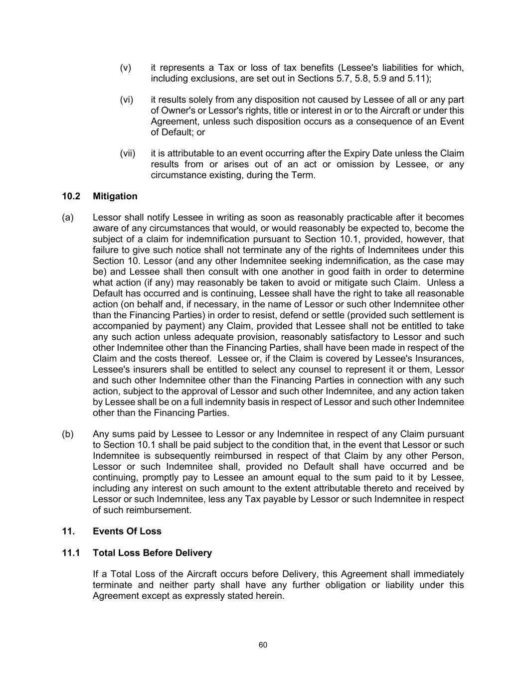 60 (v) it represents a Tax or loss of tax benefits (Lessee's liabilities for which, including exclusions, are set out in Sections 5.7, 5.8, 5.9 and 5.11); (vi) it results solely from any disposition not caused by Lessee of all or any part of Owner's or Lessor's rights, title or interest in or to the Aircraft or under this Agreement, unless such disposition occurs as a consequence of an Event of Default; or (vii) it is attributable to an event occurring after the Expiry Date unless the Claim results from or arises out of an act or omission by Lessee, or any circumstance existing, during the Term. 10.2 Mitigation (a) Lessor shall notify Lessee in writing as soon as reasonably practicable after it becomes aware of any circumstances that would, or would reasonably be expected to, become the subject of a claim for indemnification pursuant to Section 10.1, provided, however, that failure to give such notice shall not terminate any of the rights of Indemnitees under this Section 10. Lessor (and any other Indemnitee seeking indemnification, as the case may be) and Lessee shall then consult with one another in good faith in order to determine what action (if any) may reasonably be taken to avoid or mitigate such Claim. Unless a Default has occurred and is continuing, Lessee shall have the right to take all reasonable action (on behalf and, if necessary, in the name of Lessor or such other Indemnitee other than the Financing Parties) in order to resist, defend or settle (provided such settlement is accompanied by payment) any Claim, provided that Lessee shall not be entitled to take any such action unless adequate provision, reasonably satisfactory to Lessor and such other Indemnitee other than the Financing Parties, shall have been made in respect of the Claim and the costs thereof. Lessee or, if the Claim is covered by Lessee's Insurances, Lessee's insurers shall be entitled to select any counsel to represent it or them, Lessor and such other Indemnitee other than the Financing Parties in connection with any such action, subject to the approval of Lessor and such other Indemnitee, and any action taken by Lessee shall be on a full indemnity basis in respect of Lessor and such other Indemnitee other than the Financing Parties. (b) Any sums paid by Lessee to Lessor or any Indemnitee in respect of any Claim pursuant to Section 10.1 shall be paid subject to the condition that, in the event that Lessor or such Indemnitee is subsequently reimbursed in respect of that Claim by any other Person, Lessor or such Indemnitee shall, provided no Default shall have occurred and be continuing, promptly pay to Lessee an amount equal to the sum paid to it by Lessee, including any interest on such amount to the extent attributable thereto and received by Lessor or such Indemnitee, less any Tax payable by Lessor or such Indemnitee in respect of such reimbursement. 11. Events Of Loss 11.1 Total Loss Before Delivery If a Total Loss of the Aircraft occurs before Delivery, this Agreement shall immediately terminate and neither party shall have any further obligation or liability under this Agreement except as expressly stated herein.