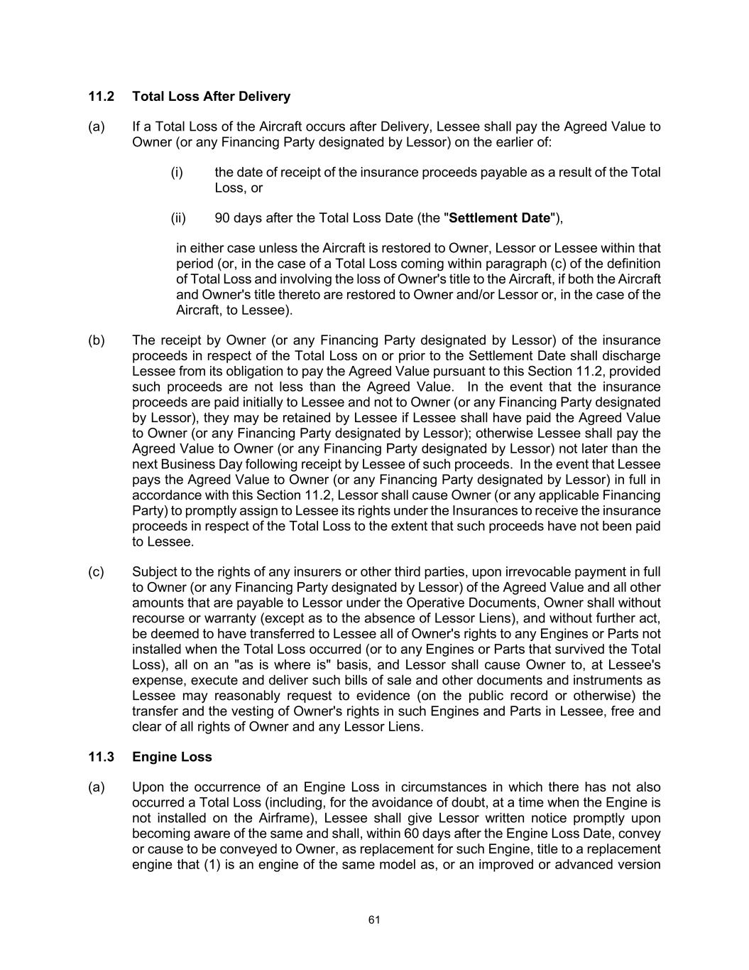 61 11.2 Total Loss After Delivery (a) If a Total Loss of the Aircraft occurs after Delivery, Lessee shall pay the Agreed Value to Owner (or any Financing Party designated by Lessor) on the earlier of: (i) the date of receipt of the insurance proceeds payable as a result of the Total Loss, or (ii) 90 days after the Total Loss Date (the "Settlement Date"), in either case unless the Aircraft is restored to Owner, Lessor or Lessee within that period (or, in the case of a Total Loss coming within paragraph (c) of the definition of Total Loss and involving the loss of Owner's title to the Aircraft, if both the Aircraft and Owner's title thereto are restored to Owner and/or Lessor or, in the case of the Aircraft, to Lessee). (b) The receipt by Owner (or any Financing Party designated by Lessor) of the insurance proceeds in respect of the Total Loss on or prior to the Settlement Date shall discharge Lessee from its obligation to pay the Agreed Value pursuant to this Section 11.2, provided such proceeds are not less than the Agreed Value. In the event that the insurance proceeds are paid initially to Lessee and not to Owner (or any Financing Party designated by Lessor), they may be retained by Lessee if Lessee shall have paid the Agreed Value to Owner (or any Financing Party designated by Lessor); otherwise Lessee shall pay the Agreed Value to Owner (or any Financing Party designated by Lessor) not later than the next Business Day following receipt by Lessee of such proceeds. In the event that Lessee pays the Agreed Value to Owner (or any Financing Party designated by Lessor) in full in accordance with this Section 11.2, Lessor shall cause Owner (or any applicable Financing Party) to promptly assign to Lessee its rights under the Insurances to receive the insurance proceeds in respect of the Total Loss to the extent that such proceeds have not been paid to Lessee. (c) Subject to the rights of any insurers or other third parties, upon irrevocable payment in full to Owner (or any Financing Party designated by Lessor) of the Agreed Value and all other amounts that are payable to Lessor under the Operative Documents, Owner shall without recourse or warranty (except as to the absence of Lessor Liens), and without further act, be deemed to have transferred to Lessee all of Owner's rights to any Engines or Parts not installed when the Total Loss occurred (or to any Engines or Parts that survived the Total Loss), all on an "as is where is" basis, and Lessor shall cause Owner to, at Lessee's expense, execute and deliver such bills of sale and other documents and instruments as Lessee may reasonably request to evidence (on the public record or otherwise) the transfer and the vesting of Owner's rights in such Engines and Parts in Lessee, free and clear of all rights of Owner and any Lessor Liens. 11.3 Engine Loss (a) Upon the occurrence of an Engine Loss in circumstances in which there has not also occurred a Total Loss (including, for the avoidance of doubt, at a time when the Engine is not installed on the Airframe), Lessee shall give Lessor written notice promptly upon becoming aware of the same and shall, within 60 days after the Engine Loss Date, convey or cause to be conveyed to Owner, as replacement for such Engine, title to a replacement engine that (1) is an engine of the same model as, or an improved or advanced version