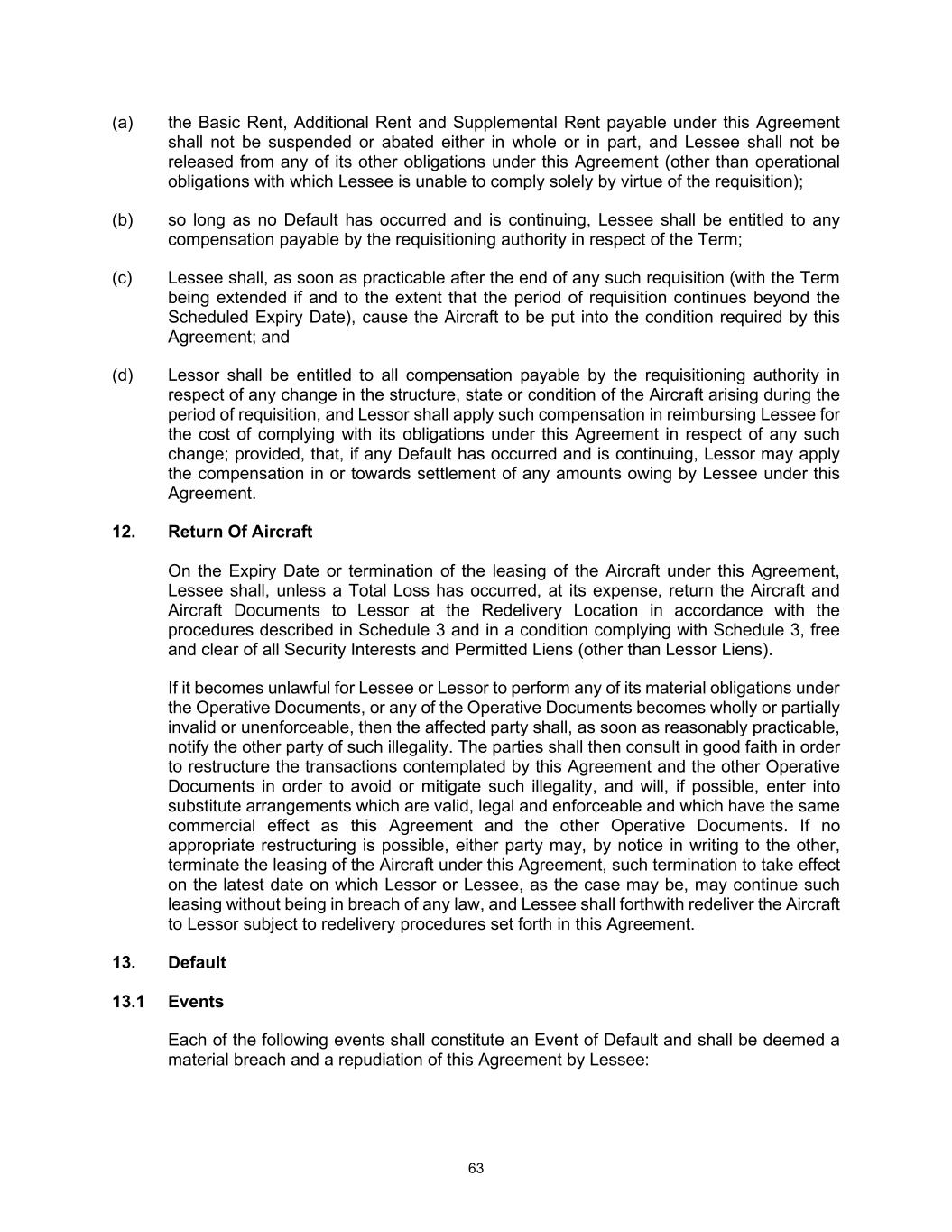 63 (a) the Basic Rent, Additional Rent and Supplemental Rent payable under this Agreement shall not be suspended or abated either in whole or in part, and Lessee shall not be released from any of its other obligations under this Agreement (other than operational obligations with which Lessee is unable to comply solely by virtue of the requisition); (b) so long as no Default has occurred and is continuing, Lessee shall be entitled to any compensation payable by the requisitioning authority in respect of the Term; (c) Lessee shall, as soon as practicable after the end of any such requisition (with the Term being extended if and to the extent that the period of requisition continues beyond the Scheduled Expiry Date), cause the Aircraft to be put into the condition required by this Agreement; and (d) Lessor shall be entitled to all compensation payable by the requisitioning authority in respect of any change in the structure, state or condition of the Aircraft arising during the period of requisition, and Lessor shall apply such compensation in reimbursing Lessee for the cost of complying with its obligations under this Agreement in respect of any such change; provided, that, if any Default has occurred and is continuing, Lessor may apply the compensation in or towards settlement of any amounts owing by Lessee under this Agreement. 12. Return Of Aircraft On the Expiry Date or termination of the leasing of the Aircraft under this Agreement, Lessee shall, unless a Total Loss has occurred, at its expense, return the Aircraft and Aircraft Documents to Lessor at the Redelivery Location in accordance with the procedures described in Schedule 3 and in a condition complying with Schedule 3, free and clear of all Security Interests and Permitted Liens (other than Lessor Liens). If it becomes unlawful for Lessee or Lessor to perform any of its material obligations under the Operative Documents, or any of the Operative Documents becomes wholly or partially invalid or unenforceable, then the affected party shall, as soon as reasonably practicable, notify the other party of such illegality. The parties shall then consult in good faith in order to restructure the transactions contemplated by this Agreement and the other Operative Documents in order to avoid or mitigate such illegality, and will, if possible, enter into substitute arrangements which are valid, legal and enforceable and which have the same commercial effect as this Agreement and the other Operative Documents. If no appropriate restructuring is possible, either party may, by notice in writing to the other, terminate the leasing of the Aircraft under this Agreement, such termination to take effect on the latest date on which Lessor or Lessee, as the case may be, may continue such leasing without being in breach of any law, and Lessee shall forthwith redeliver the Aircraft to Lessor subject to redelivery procedures set forth in this Agreement. 13. Default 13.1 Events Each of the following events shall constitute an Event of Default and shall be deemed a material breach and a repudiation of this Agreement by Lessee:
