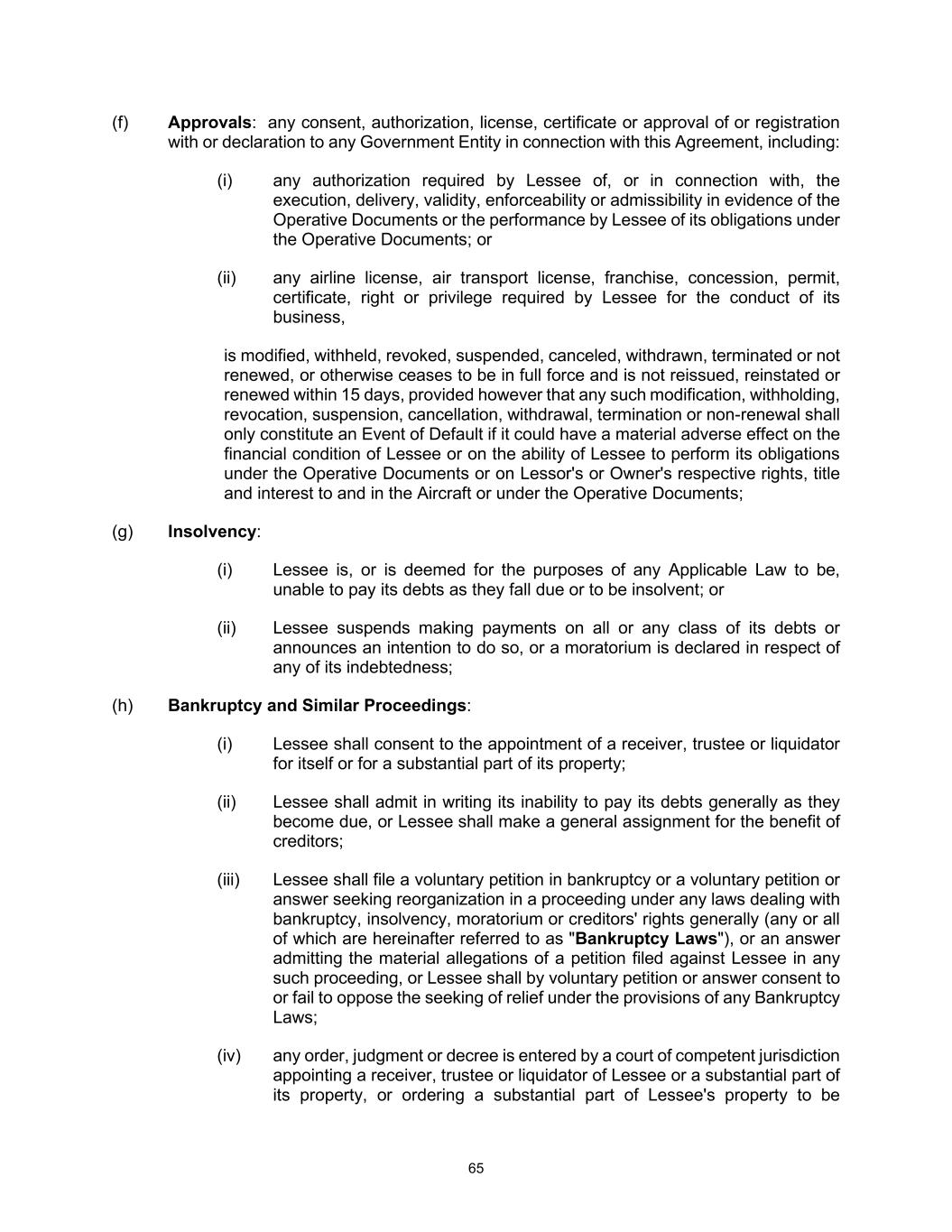 65 (f) Approvals: any consent, authorization, license, certificate or approval of or registration with or declaration to any Government Entity in connection with this Agreement, including: (i) any authorization required by Lessee of, or in connection with, the execution, delivery, validity, enforceability or admissibility in evidence of the Operative Documents or the performance by Lessee of its obligations under the Operative Documents; or (ii) any airline license, air transport license, franchise, concession, permit, certificate, right or privilege required by Lessee for the conduct of its business, is modified, withheld, revoked, suspended, canceled, withdrawn, terminated or not renewed, or otherwise ceases to be in full force and is not reissued, reinstated or renewed within 15 days, provided however that any such modification, withholding, revocation, suspension, cancellation, withdrawal, termination or non-renewal shall only constitute an Event of Default if it could have a material adverse effect on the financial condition of Lessee or on the ability of Lessee to perform its obligations under the Operative Documents or on Lessor's or Owner's respective rights, title and interest to and in the Aircraft or under the Operative Documents; (g) Insolvency: (i) Lessee is, or is deemed for the purposes of any Applicable Law to be, unable to pay its debts as they fall due or to be insolvent; or (ii) Lessee suspends making payments on all or any class of its debts or announces an intention to do so, or a moratorium is declared in respect of any of its indebtedness; (h) Bankruptcy and Similar Proceedings: (i) Lessee shall consent to the appointment of a receiver, trustee or liquidator for itself or for a substantial part of its property; (ii) Lessee shall admit in writing its inability to pay its debts generally as they become due, or Lessee shall make a general assignment for the benefit of creditors; (iii) Lessee shall file a voluntary petition in bankruptcy or a voluntary petition or answer seeking reorganization in a proceeding under any laws dealing with bankruptcy, insolvency, moratorium or creditors' rights generally (any or all of which are hereinafter referred to as "Bankruptcy Laws"), or an answer admitting the material allegations of a petition filed against Lessee in any such proceeding, or Lessee shall by voluntary petition or answer consent to or fail to oppose the seeking of relief under the provisions of any Bankruptcy Laws; (iv) any order, judgment or decree is entered by a court of competent jurisdiction appointing a receiver, trustee or liquidator of Lessee or a substantial part of its property, or ordering a substantial part of Lessee's property to be