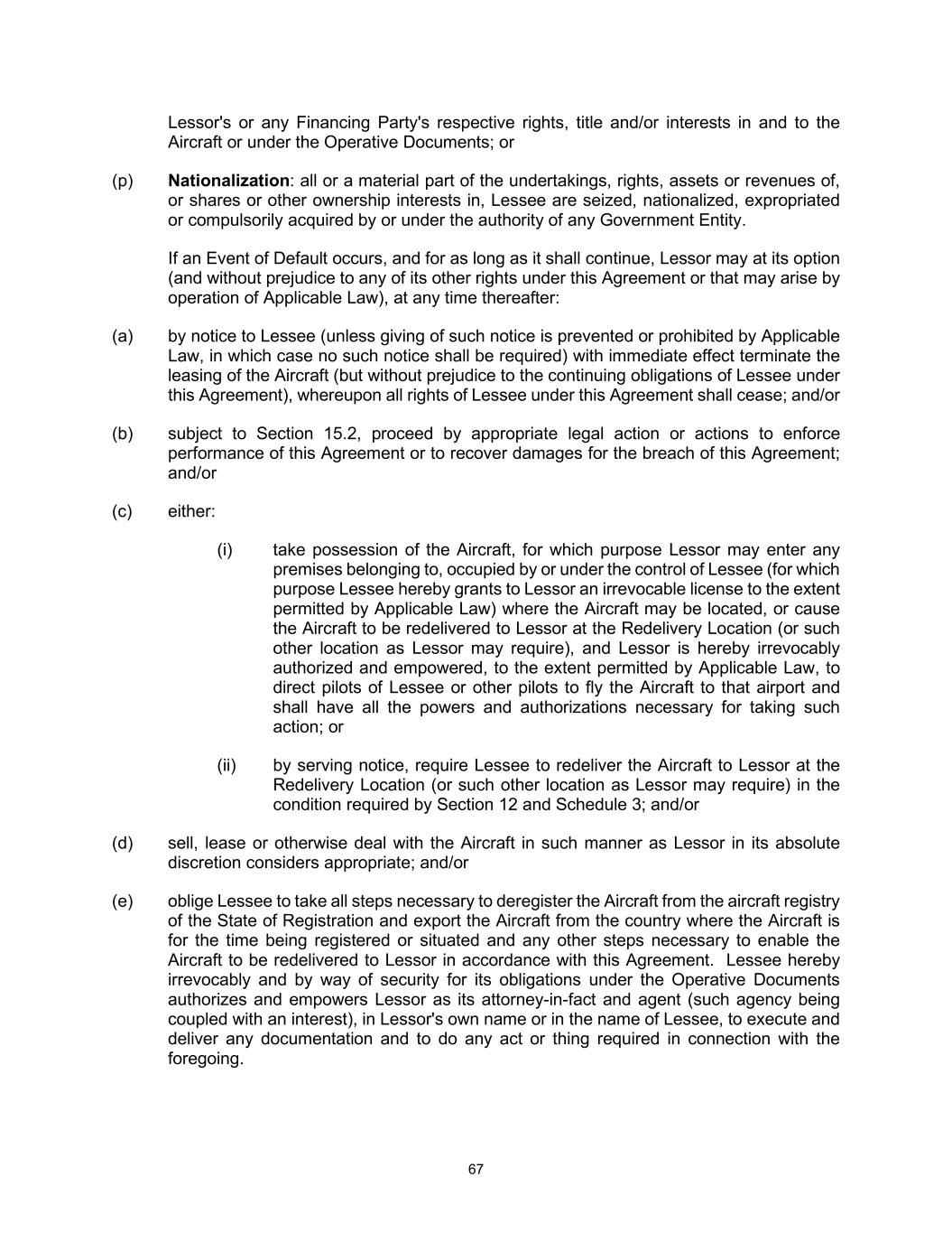 67 Lessor's or any Financing Party's respective rights, title and/or interests in and to the Aircraft or under the Operative Documents; or (p) Nationalization: all or a material part of the undertakings, rights, assets or revenues of, or shares or other ownership interests in, Lessee are seized, nationalized, expropriated or compulsorily acquired by or under the authority of any Government Entity. If an Event of Default occurs, and for as long as it shall continue, Lessor may at its option (and without prejudice to any of its other rights under this Agreement or that may arise by operation of Applicable Law), at any time thereafter: (a) by notice to Lessee (unless giving of such notice is prevented or prohibited by Applicable Law, in which case no such notice shall be required) with immediate effect terminate the leasing of the Aircraft (but without prejudice to the continuing obligations of Lessee under this Agreement), whereupon all rights of Lessee under this Agreement shall cease; and/or (b) subject to Section 15.2, proceed by appropriate legal action or actions to enforce performance of this Agreement or to recover damages for the breach of this Agreement; and/or (c) either: (i) take possession of the Aircraft, for which purpose Lessor may enter any premises belonging to, occupied by or under the control of Lessee (for which purpose Lessee hereby grants to Lessor an irrevocable license to the extent permitted by Applicable Law) where the Aircraft may be located, or cause the Aircraft to be redelivered to Lessor at the Redelivery Location (or such other location as Lessor may require), and Lessor is hereby irrevocably authorized and empowered, to the extent permitted by Applicable Law, to direct pilots of Lessee or other pilots to fly the Aircraft to that airport and shall have all the powers and authorizations necessary for taking such action; or (ii) by serving notice, require Lessee to redeliver the Aircraft to Lessor at the Redelivery Location (or such other location as Lessor may require) in the condition required by Section 12 and Schedule 3; and/or (d) sell, lease or otherwise deal with the Aircraft in such manner as Lessor in its absolute discretion considers appropriate; and/or (e) oblige Lessee to take all steps necessary to deregister the Aircraft from the aircraft registry of the State of Registration and export the Aircraft from the country where the Aircraft is for the time being registered or situated and any other steps necessary to enable the Aircraft to be redelivered to Lessor in accordance with this Agreement. Lessee hereby irrevocably and by way of security for its obligations under the Operative Documents authorizes and empowers Lessor as its attorney-in-fact and agent (such agency being coupled with an interest), in Lessor's own name or in the name of Lessee, to execute and deliver any documentation and to do any act or thing required in connection with the foregoing.