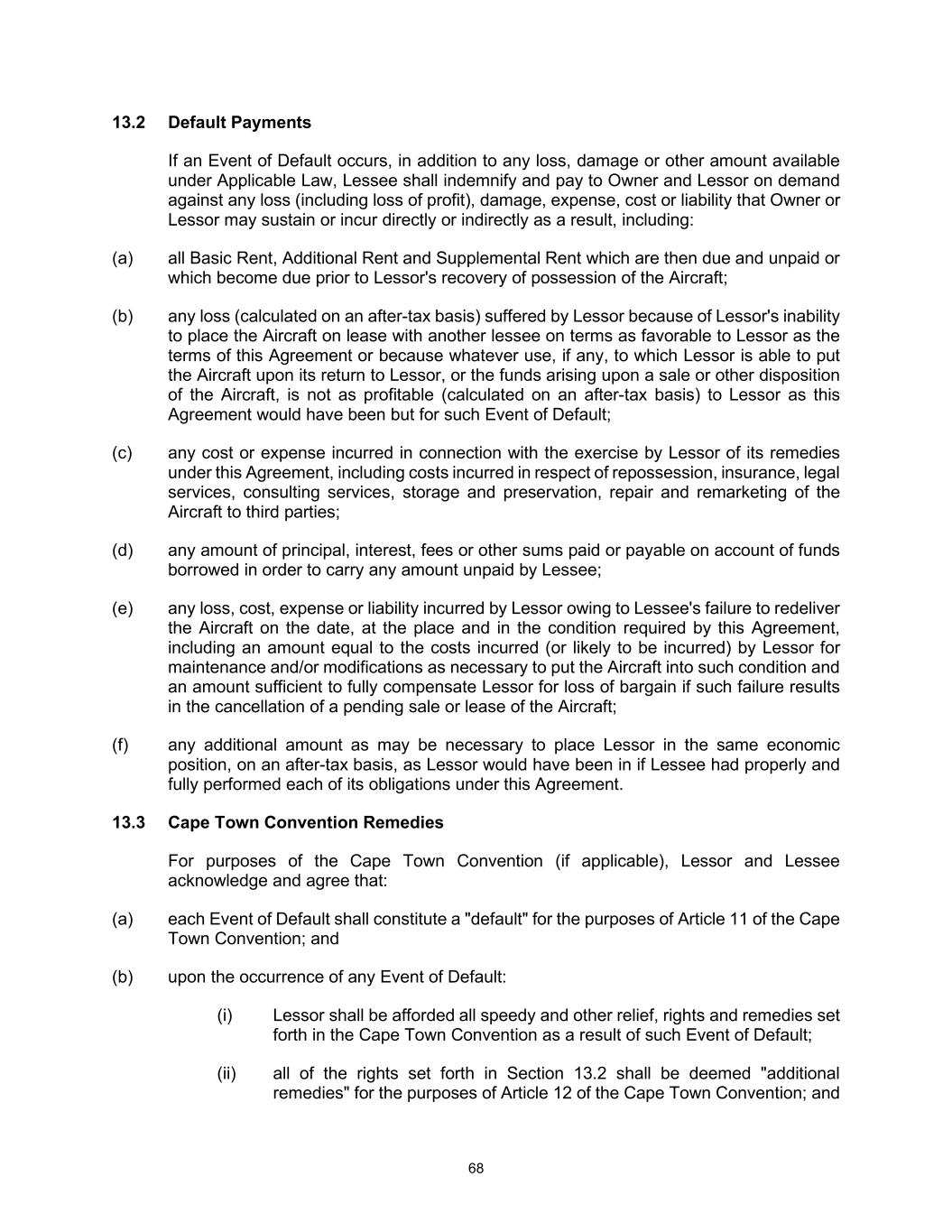 68 13.2 Default Payments If an Event of Default occurs, in addition to any loss, damage or other amount available under Applicable Law, Lessee shall indemnify and pay to Owner and Lessor on demand against any loss (including loss of profit), damage, expense, cost or liability that Owner or Lessor may sustain or incur directly or indirectly as a result, including: (a) all Basic Rent, Additional Rent and Supplemental Rent which are then due and unpaid or which become due prior to Lessor's recovery of possession of the Aircraft; (b) any loss (calculated on an after-tax basis) suffered by Lessor because of Lessor's inability to place the Aircraft on lease with another lessee on terms as favorable to Lessor as the terms of this Agreement or because whatever use, if any, to which Lessor is able to put the Aircraft upon its return to Lessor, or the funds arising upon a sale or other disposition of the Aircraft, is not as profitable (calculated on an after-tax basis) to Lessor as this Agreement would have been but for such Event of Default; (c) any cost or expense incurred in connection with the exercise by Lessor of its remedies under this Agreement, including costs incurred in respect of repossession, insurance, legal services, consulting services, storage and preservation, repair and remarketing of the Aircraft to third parties; (d) any amount of principal, interest, fees or other sums paid or payable on account of funds borrowed in order to carry any amount unpaid by Lessee; (e) any loss, cost, expense or liability incurred by Lessor owing to Lessee's failure to redeliver the Aircraft on the date, at the place and in the condition required by this Agreement, including an amount equal to the costs incurred (or likely to be incurred) by Lessor for maintenance and/or modifications as necessary to put the Aircraft into such condition and an amount sufficient to fully compensate Lessor for loss of bargain if such failure results in the cancellation of a pending sale or lease of the Aircraft; (f) any additional amount as may be necessary to place Lessor in the same economic position, on an after-tax basis, as Lessor would have been in if Lessee had properly and fully performed each of its obligations under this Agreement. 13.3 Cape Town Convention Remedies For purposes of the Cape Town Convention (if applicable), Lessor and Lessee acknowledge and agree that: (a) each Event of Default shall constitute a "default" for the purposes of Article 11 of the Cape Town Convention; and (b) upon the occurrence of any Event of Default: (i) Lessor shall be afforded all speedy and other relief, rights and remedies set forth in the Cape Town Convention as a result of such Event of Default; (ii) all of the rights set forth in Section 13.2 shall be deemed "additional remedies" for the purposes of Article 12 of the Cape Town Convention; and