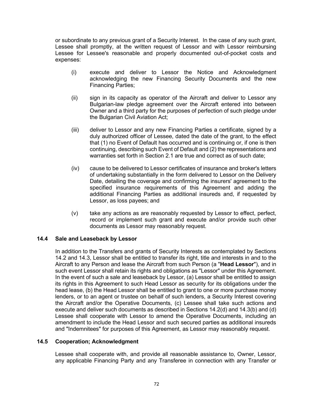 72 or subordinate to any previous grant of a Security Interest. In the case of any such grant, Lessee shall promptly, at the written request of Lessor and with Lessor reimbursing Lessee for Lessee's reasonable and properly documented out-of-pocket costs and expenses: (i) execute and deliver to Lessor the Notice and Acknowledgment acknowledging the new Financing Security Documents and the new Financing Parties; (ii) sign in its capacity as operator of the Aircraft and deliver to Lessor any Bulgarian-law pledge agreement over the Aircraft entered into between Owner and a third party for the purposes of perfection of such pledge under the Bulgarian Civil Aviation Act; (iii) deliver to Lessor and any new Financing Parties a certificate, signed by a duly authorized officer of Lessee, dated the date of the grant, to the effect that (1) no Event of Default has occurred and is continuing or, if one is then continuing, describing such Event of Default and (2) the representations and warranties set forth in Section 2.1 are true and correct as of such date; (iv) cause to be delivered to Lessor certificates of insurance and broker's letters of undertaking substantially in the form delivered to Lessor on the Delivery Date, detailing the coverage and confirming the insurers' agreement to the specified insurance requirements of this Agreement and adding the additional Financing Parties as additional insureds and, if requested by Lessor, as loss payees; and (v) take any actions as are reasonably requested by Lessor to effect, perfect, record or implement such grant and execute and/or provide such other documents as Lessor may reasonably request. 14.4 Sale and Leaseback by Lessor In addition to the Transfers and grants of Security Interests as contemplated by Sections 14.2 and 14.3, Lessor shall be entitled to transfer its right, title and interests in and to the Aircraft to any Person and lease the Aircraft from such Person (a "Head Lessor"), and in such event Lessor shall retain its rights and obligations as "Lessor" under this Agreement. In the event of such a sale and leaseback by Lessor, (a) Lessor shall be entitled to assign its rights in this Agreement to such Head Lessor as security for its obligations under the head lease, (b) the Head Lessor shall be entitled to grant to one or more purchase money lenders, or to an agent or trustee on behalf of such lenders, a Security Interest covering the Aircraft and/or the Operative Documents, (c) Lessee shall take such actions and execute and deliver such documents as described in Sections 14.2(d) and 14.3(b) and (d) Lessee shall cooperate with Lessor to amend the Operative Documents, including an amendment to include the Head Lessor and such secured parties as additional insureds and "Indemnitees" for purposes of this Agreement, as Lessor may reasonably request. 14.5 Cooperation; Acknowledgment Lessee shall cooperate with, and provide all reasonable assistance to, Owner, Lessor, any applicable Financing Party and any Transferee in connection with any Transfer or