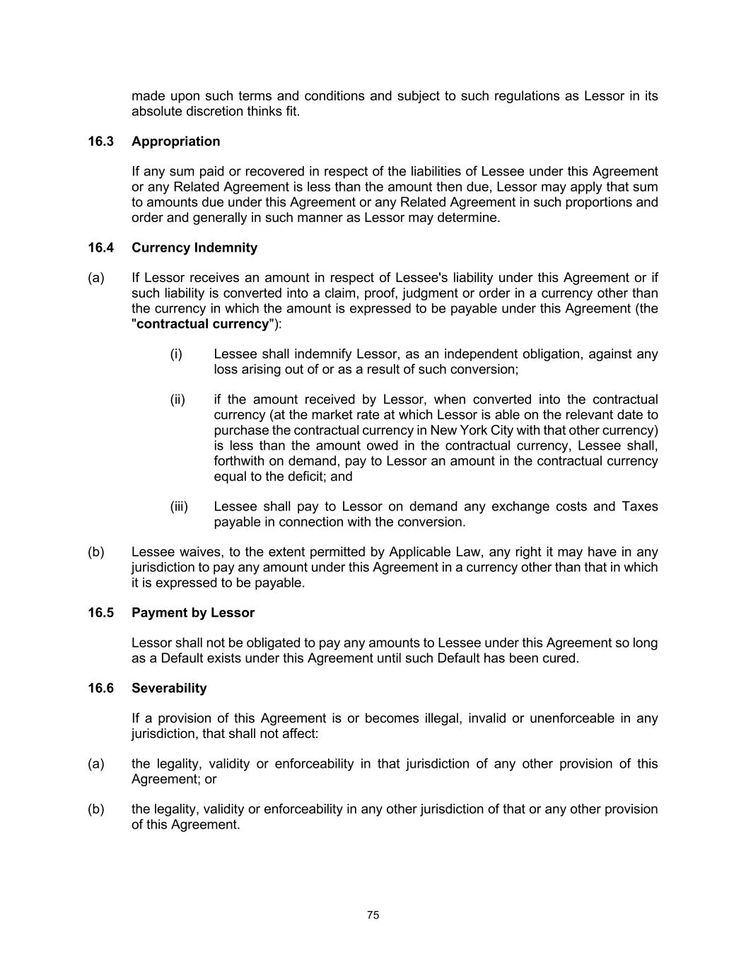 75 made upon such terms and conditions and subject to such regulations as Lessor in its absolute discretion thinks fit. 16.3 Appropriation If any sum paid or recovered in respect of the liabilities of Lessee under this Agreement or any Related Agreement is less than the amount then due, Lessor may apply that sum to amounts due under this Agreement or any Related Agreement in such proportions and order and generally in such manner as Lessor may determine. 16.4 Currency Indemnity (a) If Lessor receives an amount in respect of Lessee's liability under this Agreement or if such liability is converted into a claim, proof, judgment or order in a currency other than the currency in which the amount is expressed to be payable under this Agreement (the "contractual currency"): (i) Lessee shall indemnify Lessor, as an independent obligation, against any loss arising out of or as a result of such conversion; (ii) if the amount received by Lessor, when converted into the contractual currency (at the market rate at which Lessor is able on the relevant date to purchase the contractual currency in New York City with that other currency) is less than the amount owed in the contractual currency, Lessee shall, forthwith on demand, pay to Lessor an amount in the contractual currency equal to the deficit; and (iii) Lessee shall pay to Lessor on demand any exchange costs and Taxes payable in connection with the conversion. (b) Lessee waives, to the extent permitted by Applicable Law, any right it may have in any jurisdiction to pay any amount under this Agreement in a currency other than that in which it is expressed to be payable. 16.5 Payment by Lessor Lessor shall not be obligated to pay any amounts to Lessee under this Agreement so long as a Default exists under this Agreement until such Default has been cured. 16.6 Severability If a provision of this Agreement is or becomes illegal, invalid or unenforceable in any jurisdiction, that shall not affect: (a) the legality, validity or enforceability in that jurisdiction of any other provision of this Agreement; or (b) the legality, validity or enforceability in any other jurisdiction of that or any other provision of this Agreement.