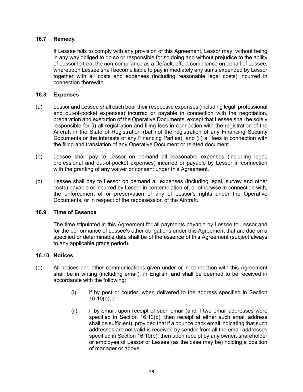 76 16.7 Remedy If Lessee fails to comply with any provision of this Agreement, Lessor may, without being in any way obliged to do so or responsible for so doing and without prejudice to the ability of Lessor to treat the non-compliance as a Default, effect compliance on behalf of Lessee, whereupon Lessee shall become liable to pay immediately any sums expended by Lessor together with all costs and expenses (including reasonable legal costs) incurred in connection therewith. 16.8 Expenses (a) Lessor and Lessee shall each bear their respective expenses (including legal, professional and out-of-pocket expenses) incurred or payable in connection with the negotiation, preparation and execution of the Operative Documents, except that Lessee shall be solely responsible for (i) all registration and filing fees in connection with the registration of the Aircraft in the State of Registration (but not the registration of any Financing Security Documents or the interests of any Financing Parties), and (ii) all fees in connection with the filing and translation of any Operative Document or related document. (b) Lessee shall pay to Lessor on demand all reasonable expenses (including legal, professional and out-of-pocket expenses) incurred or payable by Lessor in connection with the granting of any waiver or consent under this Agreement. (c) Lessee shall pay to Lessor on demand all expenses (including legal, survey and other costs) payable or incurred by Lessor in contemplation of, or otherwise in connection with, the enforcement of or preservation of any of Lessor's rights under the Operative Documents, or in respect of the repossession of the Aircraft. 16.9 Time of Essence The time stipulated in this Agreement for all payments payable by Lessee to Lessor and for the performance of Lessee's other obligations under this Agreement that are due on a specified or determinable date shall be of the essence of this Agreement (subject always to any applicable grace period). 16.10 Notices (a) All notices and other communications given under or in connection with this Agreement shall be in writing (including email), in English, and shall be deemed to be received in accordance with the following: (i) if by post or courier, when delivered to the address specified in Section 16.10(b), or (ii) if by email, upon receipt of such email (and if two email addresses were specified in Section 16.10(b), then receipt at either such email address shall be sufficient), provided that if a bounce back email indicating that such addresses are not valid is received by sender from all the email addresses specified in Section 16.10(b), then upon receipt by any owner, shareholder or employee of Lessor or Lessee (as the case may be) holding a position of manager or above.
