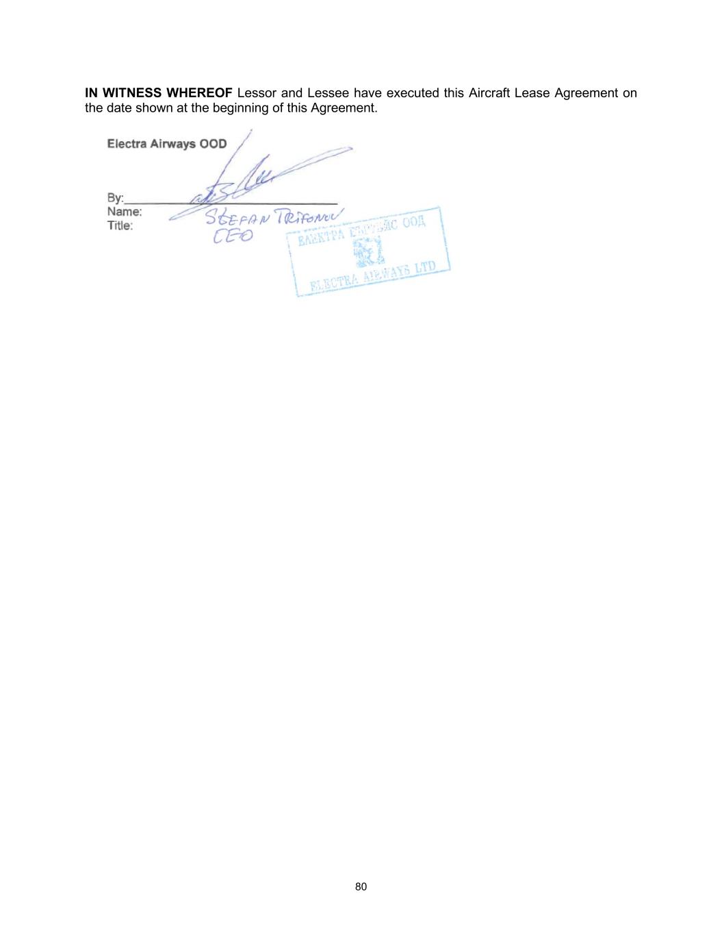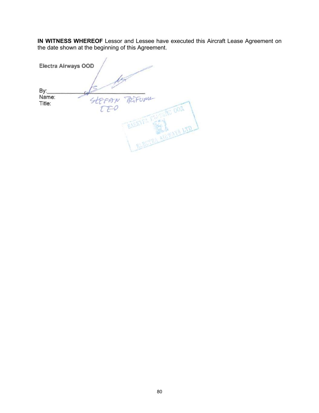 80 IN WITNESS WHEREOF Lessor and Lessee have executed this Aircraft Lease Agreement on the date shown at the beginning of this Agreement. Electra Airways OOD By:________________________________ Name: Title: