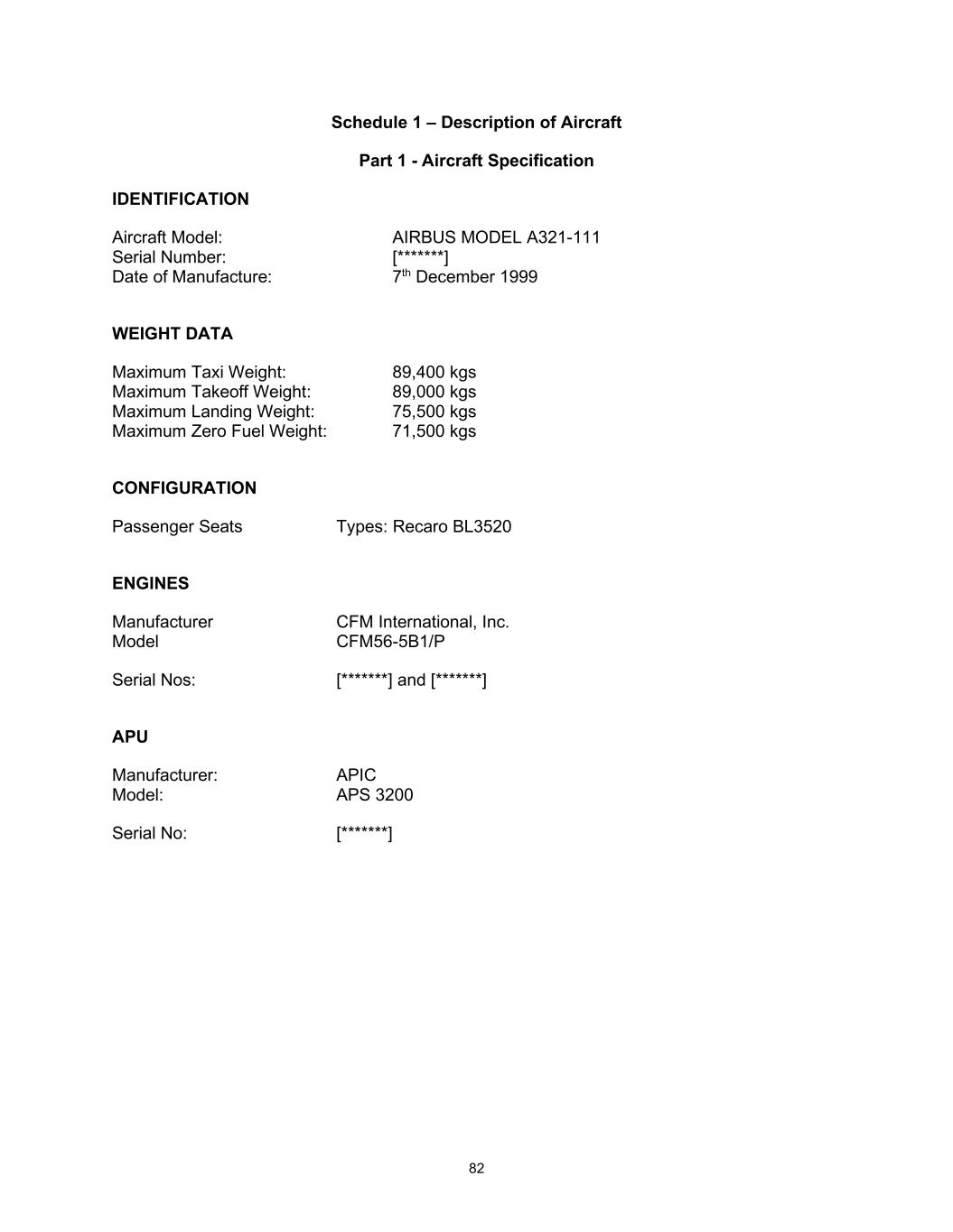 82 Schedule 1 – Description of Aircraft Part 1 - Aircraft Specification IDENTIFICATION Aircraft Model: AIRBUS MODEL A321-111 Serial Number: [*******] Date of Manufacture: 7th December 1999 WEIGHT DATA Maximum Taxi Weight: 89,400 kgs Maximum Takeoff Weight: 89,000 kgs Maximum Landing Weight: 75,500 kgs Maximum Zero Fuel Weight: 71,500 kgs CONFIGURATION Passenger Seats Types: Recaro BL3520 ENGINES Manufacturer CFM International, Inc. Model CFM56-5B1/P Serial Nos: [*******] and [*******] APU Manufacturer: APIC Model: APS 3200 Serial No: [*******]