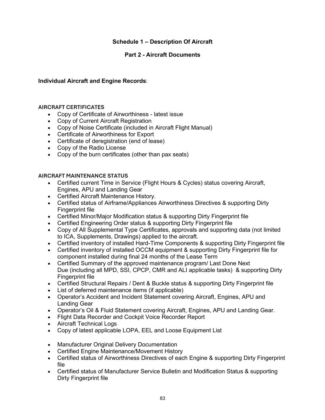 83 Schedule 1 – Description Of Aircraft Part 2 - Aircraft Documents Individual Aircraft and Engine Records: AIRCRAFT CERTIFICATES • Copy of Certificate of Airworthiness - latest issue • Copy of Current Aircraft Registration • Copy of Noise Certificate (included in Aircraft Flight Manual) • Certificate of Airworthiness for Export • Certificate of deregistration (end of lease) • Copy of the Radio License • Copy of the burn certificates (other than pax seats) AIRCRAFT MAINTENANCE STATUS • Certified current Time in Service (Flight Hours & Cycles) status covering Aircraft, Engines, APU and Landing Gear • Certified Aircraft Maintenance History. • Certified status of Airframe/Appliances Airworthiness Directives & supporting Dirty Fingerprint file • Certified Minor/Major Modification status & supporting Dirty Fingerprint file • Certified Engineering Order status & supporting Dirty Fingerprint file • Copy of All Supplemental Type Certificates, approvals and supporting data (not limited to ICA, Supplements, Drawings) applied to the aircraft. • Certified inventory of installed Hard-Time Components & supporting Dirty Fingerprint file • Certified inventory of installed OCCM equipment & supporting Dirty Fingerprint file for component installed during final 24 months of the Lease Term • Certified Summary of the approved maintenance program/ Last Done Next Due (including all MPD, SSI, CPCP, CMR and ALI applicable tasks) & supporting Dirty Fingerprint file • Certified Structural Repairs / Dent & Buckle status & supporting Dirty Fingerprint file • List of deferred maintenance items (if applicable) • Operator’s Accident and Incident Statement covering Aircraft, Engines, APU and Landing Gear • Operator’s Oil & Fluid Statement covering Aircraft, Engines, APU and Landing Gear. • Flight Data Recorder and Cockpit Voice Recorder Report • Aircraft Technical Logs • Copy of latest applicable LOPA, EEL and Loose Equipment List • Manufacturer Original Delivery Documentation • Certified Engine Maintenance/Movement History • Certified status of Airworthiness Directives of each Engine & supporting Dirty Fingerprint file • Certified status of Manufacturer Service Bulletin and Modification Status & supporting Dirty Fingerprint file