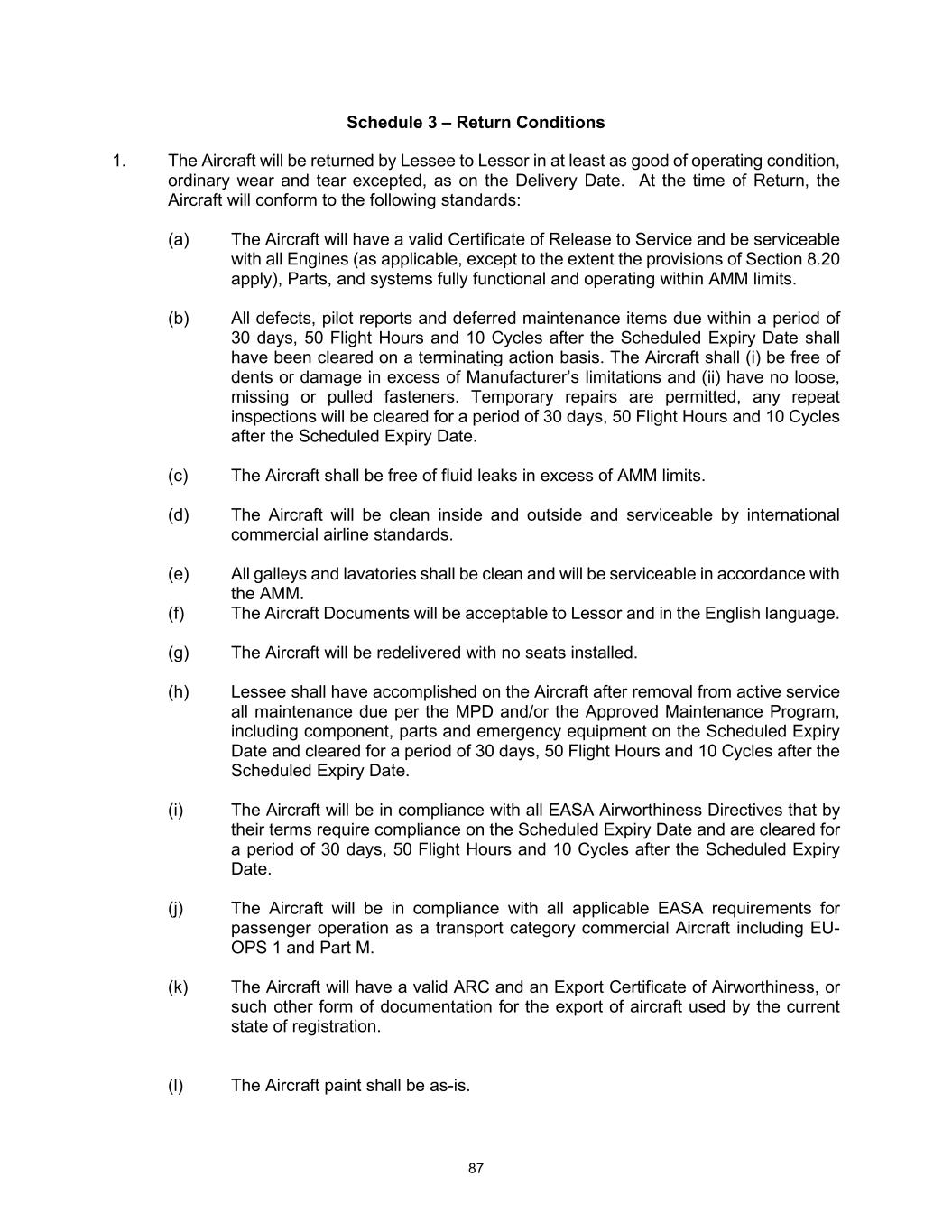 87 Schedule 3 – Return Conditions 1. The Aircraft will be returned by Lessee to Lessor in at least as good of operating condition, ordinary wear and tear excepted, as on the Delivery Date. At the time of Return, the Aircraft will conform to the following standards: (a) The Aircraft will have a valid Certificate of Release to Service and be serviceable with all Engines (as applicable, except to the extent the provisions of Section 8.20 apply), Parts, and systems fully functional and operating within AMM limits. (b) All defects, pilot reports and deferred maintenance items due within a period of 30 days, 50 Flight Hours and 10 Cycles after the Scheduled Expiry Date shall have been cleared on a terminating action basis. The Aircraft shall (i) be free of dents or damage in excess of Manufacturer’s limitations and (ii) have no loose, missing or pulled fasteners. Temporary repairs are permitted, any repeat inspections will be cleared for a period of 30 days, 50 Flight Hours and 10 Cycles after the Scheduled Expiry Date. (c) The Aircraft shall be free of fluid leaks in excess of AMM limits. (d) The Aircraft will be clean inside and outside and serviceable by international commercial airline standards. (e) All galleys and lavatories shall be clean and will be serviceable in accordance with the AMM. (f) The Aircraft Documents will be acceptable to Lessor and in the English language. (g) The Aircraft will be redelivered with no seats installed. (h) Lessee shall have accomplished on the Aircraft after removal from active service all maintenance due per the MPD and/or the Approved Maintenance Program, including component, parts and emergency equipment on the Scheduled Expiry Date and cleared for a period of 30 days, 50 Flight Hours and 10 Cycles after the Scheduled Expiry Date. (i) The Aircraft will be in compliance with all EASA Airworthiness Directives that by their terms require compliance on the Scheduled Expiry Date and are cleared for a period of 30 days, 50 Flight Hours and 10 Cycles after the Scheduled Expiry Date. (j) The Aircraft will be in compliance with all applicable EASA requirements for passenger operation as a transport category commercial Aircraft including EU- OPS 1 and Part M. (k) The Aircraft will have a valid ARC and an Export Certificate of Airworthiness, or such other form of documentation for the export of aircraft used by the current state of registration. (l) The Aircraft paint shall be as-is.