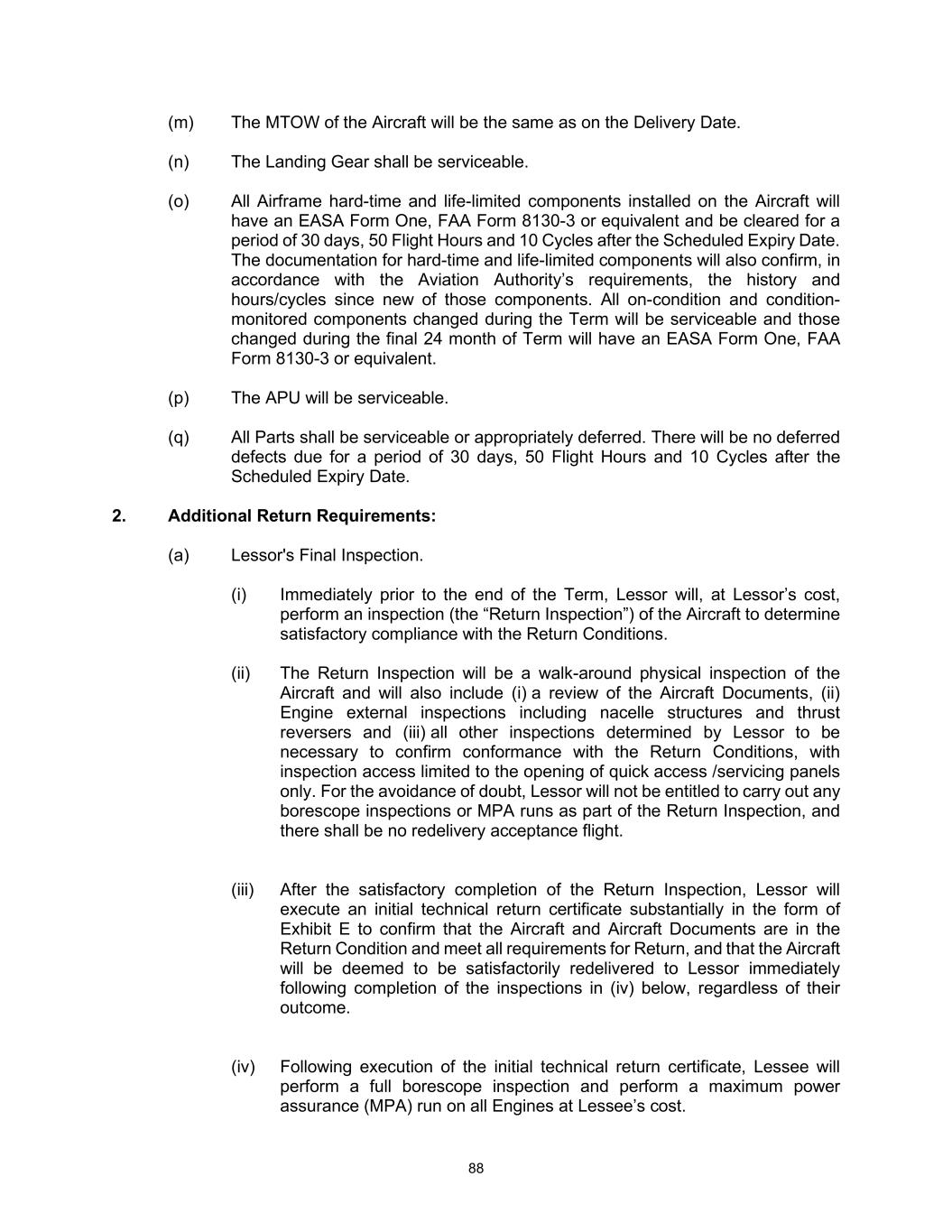 88 (m) The MTOW of the Aircraft will be the same as on the Delivery Date. (n) The Landing Gear shall be serviceable. (o) All Airframe hard-time and life-limited components installed on the Aircraft will have an EASA Form One, FAA Form 8130-3 or equivalent and be cleared for a period of 30 days, 50 Flight Hours and 10 Cycles after the Scheduled Expiry Date. The documentation for hard-time and life-limited components will also confirm, in accordance with the Aviation Authority’s requirements, the history and hours/cycles since new of those components. All on-condition and condition- monitored components changed during the Term will be serviceable and those changed during the final 24 month of Term will have an EASA Form One, FAA Form 8130-3 or equivalent. (p) The APU will be serviceable. (q) All Parts shall be serviceable or appropriately deferred. There will be no deferred defects due for a period of 30 days, 50 Flight Hours and 10 Cycles after the Scheduled Expiry Date. 2. Additional Return Requirements: (a) Lessor's Final Inspection. (i) Immediately prior to the end of the Term, Lessor will, at Lessor’s cost, perform an inspection (the “Return Inspection”) of the Aircraft to determine satisfactory compliance with the Return Conditions. (ii) The Return Inspection will be a walk-around physical inspection of the Aircraft and will also include (i) a review of the Aircraft Documents, (ii) Engine external inspections including nacelle structures and thrust reversers and (iii) all other inspections determined by Lessor to be necessary to confirm conformance with the Return Conditions, with inspection access limited to the opening of quick access /servicing panels only. For the avoidance of doubt, Lessor will not be entitled to carry out any borescope inspections or MPA runs as part of the Return Inspection, and there shall be no redelivery acceptance flight. (iii) After the satisfactory completion of the Return Inspection, Lessor will execute an initial technical return certificate substantially in the form of Exhibit E to confirm that the Aircraft and Aircraft Documents are in the Return Condition and meet all requirements for Return, and that the Aircraft will be deemed to be satisfactorily redelivered to Lessor immediately following completion of the inspections in (iv) below, regardless of their outcome. (iv) Following execution of the initial technical return certificate, Lessee will perform a full borescope inspection and perform a maximum power assurance (MPA) run on all Engines at Lessee’s cost.