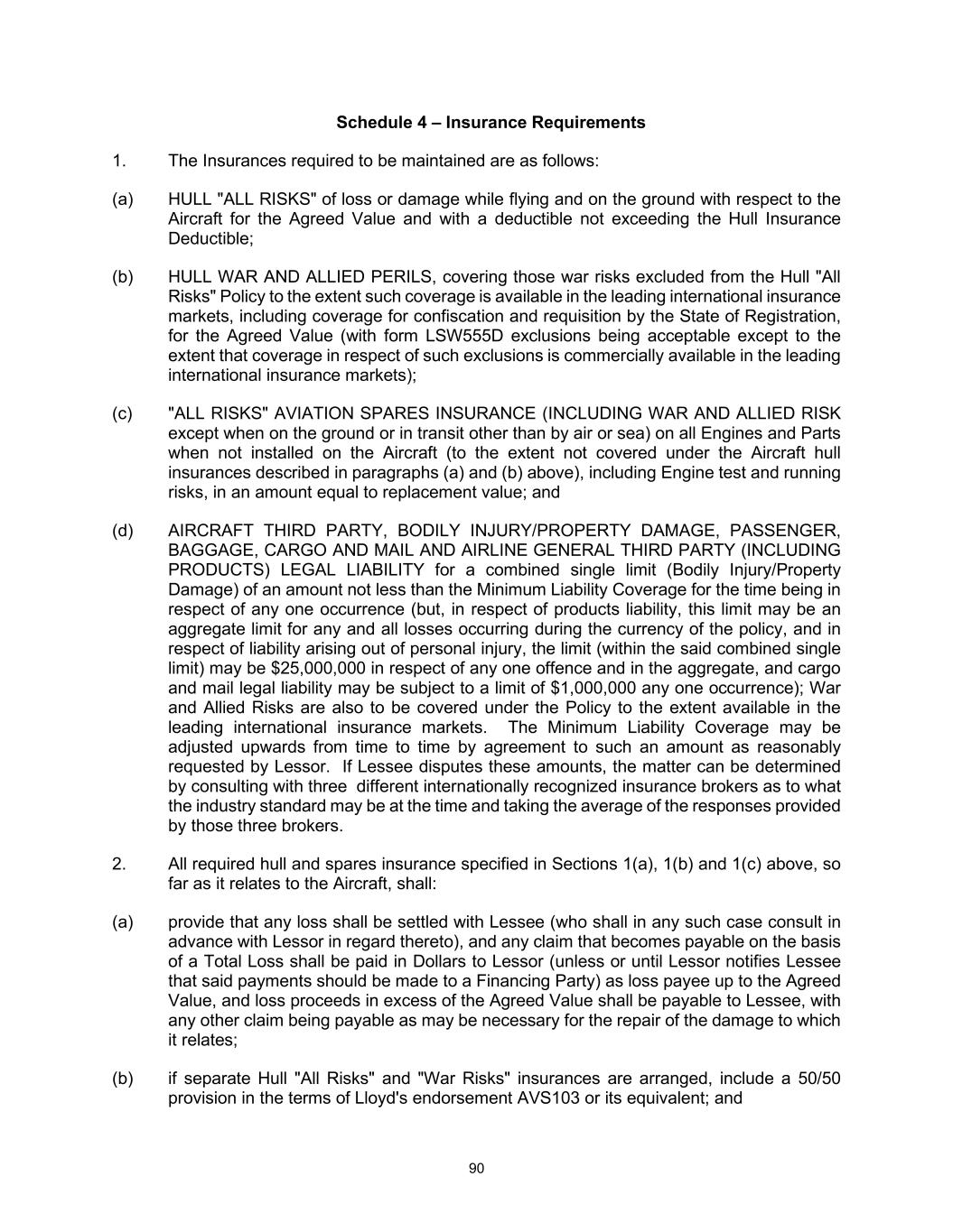 90 Schedule 4 – Insurance Requirements 1. The Insurances required to be maintained are as follows: (a) HULL "ALL RISKS" of loss or damage while flying and on the ground with respect to the Aircraft for the Agreed Value and with a deductible not exceeding the Hull Insurance Deductible; (b) HULL WAR AND ALLIED PERILS, covering those war risks excluded from the Hull "All Risks" Policy to the extent such coverage is available in the leading international insurance markets, including coverage for confiscation and requisition by the State of Registration, for the Agreed Value (with form LSW555D exclusions being acceptable except to the extent that coverage in respect of such exclusions is commercially available in the leading international insurance markets); (c) "ALL RISKS" AVIATION SPARES INSURANCE (INCLUDING WAR AND ALLIED RISK except when on the ground or in transit other than by air or sea) on all Engines and Parts when not installed on the Aircraft (to the extent not covered under the Aircraft hull insurances described in paragraphs (a) and (b) above), including Engine test and running risks, in an amount equal to replacement value; and (d) AIRCRAFT THIRD PARTY, BODILY INJURY/PROPERTY DAMAGE, PASSENGER, BAGGAGE, CARGO AND MAIL AND AIRLINE GENERAL THIRD PARTY (INCLUDING PRODUCTS) LEGAL LIABILITY for a combined single limit (Bodily Injury/Property Damage) of an amount not less than the Minimum Liability Coverage for the time being in respect of any one occurrence (but, in respect of products liability, this limit may be an aggregate limit for any and all losses occurring during the currency of the policy, and in respect of liability arising out of personal injury, the limit (within the said combined single limit) may be $25,000,000 in respect of any one offence and in the aggregate, and cargo and mail legal liability may be subject to a limit of $1,000,000 any one occurrence); War and Allied Risks are also to be covered under the Policy to the extent available in the leading international insurance markets. The Minimum Liability Coverage may be adjusted upwards from time to time by agreement to such an amount as reasonably requested by Lessor. If Lessee disputes these amounts, the matter can be determined by consulting with three different internationally recognized insurance brokers as to what the industry standard may be at the time and taking the average of the responses provided by those three brokers. 2. All required hull and spares insurance specified in Sections 1(a), 1(b) and 1(c) above, so far as it relates to the Aircraft, shall: (a) provide that any loss shall be settled with Lessee (who shall in any such case consult in advance with Lessor in regard thereto), and any claim that becomes payable on the basis of a Total Loss shall be paid in Dollars to Lessor (unless or until Lessor notifies Lessee that said payments should be made to a Financing Party) as loss payee up to the Agreed Value, and loss proceeds in excess of the Agreed Value shall be payable to Lessee, with any other claim being payable as may be necessary for the repair of the damage to which it relates; (b) if separate Hull "All Risks" and "War Risks" insurances are arranged, include a 50/50 provision in the terms of Lloyd's endorsement AVS103 or its equivalent; and
