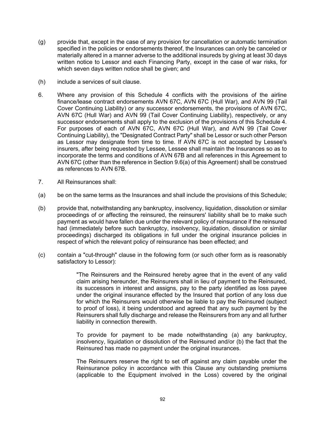 92 (g) provide that, except in the case of any provision for cancellation or automatic termination specified in the policies or endorsements thereof, the Insurances can only be canceled or materially altered in a manner adverse to the additional insureds by giving at least 30 days written notice to Lessor and each Financing Party, except in the case of war risks, for which seven days written notice shall be given; and (h) include a services of suit clause. 6. Where any provision of this Schedule 4 conflicts with the provisions of the airline finance/lease contract endorsements AVN 67C, AVN 67C (Hull War), and AVN 99 (Tail Cover Continuing Liability) or any successor endorsements, the provisions of AVN 67C, AVN 67C (Hull War) and AVN 99 (Tail Cover Continuing Liability), respectively, or any successor endorsements shall apply to the exclusion of the provisions of this Schedule 4. For purposes of each of AVN 67C, AVN 67C (Hull War), and AVN 99 (Tail Cover Continuing Liability), the "Designated Contract Party" shall be Lessor or such other Person as Lessor may designate from time to time. If AVN 67C is not accepted by Lessee's insurers, after being requested by Lessee, Lessee shall maintain the Insurances so as to incorporate the terms and conditions of AVN 67B and all references in this Agreement to AVN 67C (other than the reference in Section 9.6(a) of this Agreement) shall be construed as references to AVN 67B. 7. All Reinsurances shall: (a) be on the same terms as the Insurances and shall include the provisions of this Schedule; (b) provide that, notwithstanding any bankruptcy, insolvency, liquidation, dissolution or similar proceedings of or affecting the reinsured, the reinsurers' liability shall be to make such payment as would have fallen due under the relevant policy of reinsurance if the reinsured had (immediately before such bankruptcy, insolvency, liquidation, dissolution or similar proceedings) discharged its obligations in full under the original insurance policies in respect of which the relevant policy of reinsurance has been effected; and (c) contain a "cut-through" clause in the following form (or such other form as is reasonably satisfactory to Lessor): "The Reinsurers and the Reinsured hereby agree that in the event of any valid claim arising hereunder, the Reinsurers shall in lieu of payment to the Reinsured, its successors in interest and assigns, pay to the party identified as loss payee under the original insurance effected by the Insured that portion of any loss due for which the Reinsurers would otherwise be liable to pay the Reinsured (subject to proof of loss), it being understood and agreed that any such payment by the Reinsurers shall fully discharge and release the Reinsurers from any and all further liability in connection therewith. To provide for payment to be made notwithstanding (a) any bankruptcy, insolvency, liquidation or dissolution of the Reinsured and/or (b) the fact that the Reinsured has made no payment under the original insurances. The Reinsurers reserve the right to set off against any claim payable under the Reinsurance policy in accordance with this Clause any outstanding premiums (applicable to the Equipment involved in the Loss) covered by the original