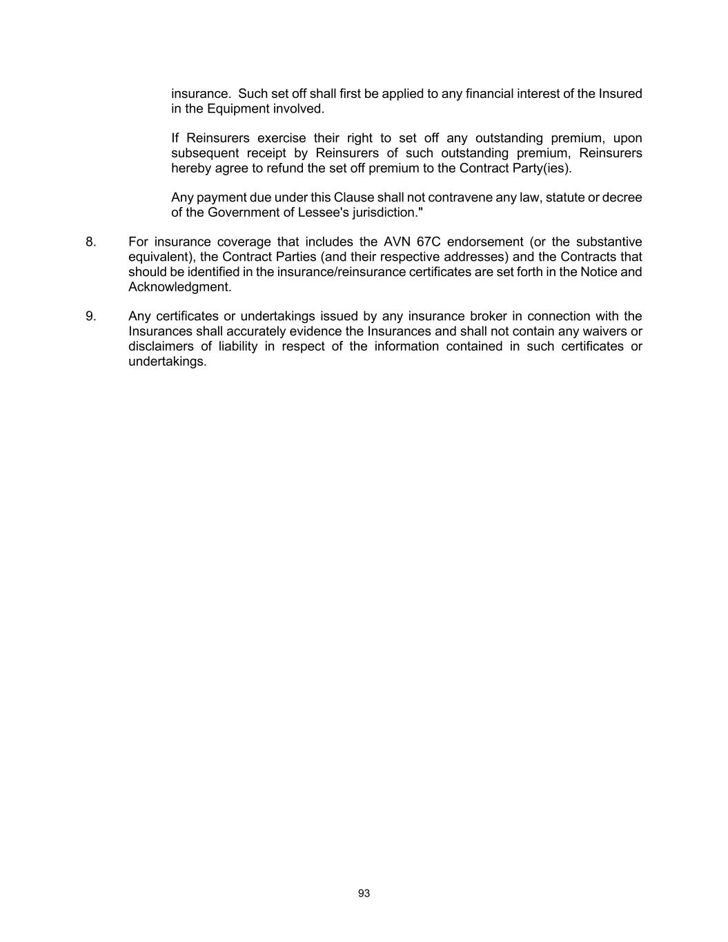 93 insurance. Such set off shall first be applied to any financial interest of the Insured in the Equipment involved. If Reinsurers exercise their right to set off any outstanding premium, upon subsequent receipt by Reinsurers of such outstanding premium, Reinsurers hereby agree to refund the set off premium to the Contract Party(ies). Any payment due under this Clause shall not contravene any law, statute or decree of the Government of Lessee's jurisdiction." 8. For insurance coverage that includes the AVN 67C endorsement (or the substantive equivalent), the Contract Parties (and their respective addresses) and the Contracts that should be identified in the insurance/reinsurance certificates are set forth in the Notice and Acknowledgment. 9. Any certificates or undertakings issued by any insurance broker in connection with the Insurances shall accurately evidence the Insurances and shall not contain any waivers or disclaimers of liability in respect of the information contained in such certificates or undertakings.