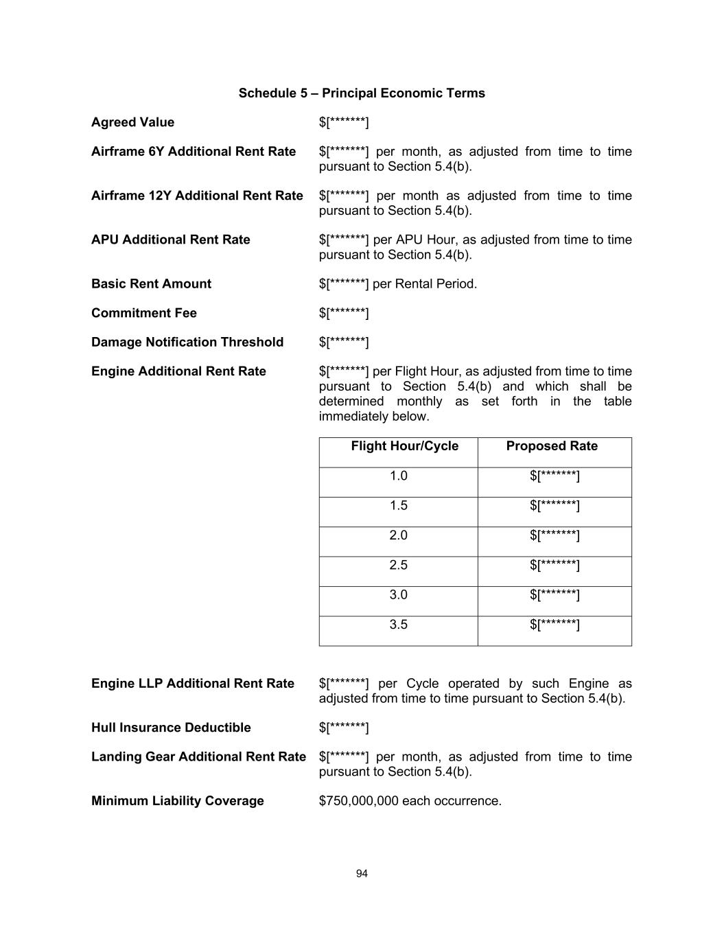 94 Schedule 5 – Principal Economic Terms Agreed Value $[*******] Airframe 6Y Additional Rent Rate $[*******] per month, as adjusted from time to time pursuant to Section 5.4(b). Airframe 12Y Additional Rent Rate $[*******] per month as adjusted from time to time pursuant to Section 5.4(b). APU Additional Rent Rate $[*******] per APU Hour, as adjusted from time to time pursuant to Section 5.4(b). Basic Rent Amount $[*******] per Rental Period. Commitment Fee $[*******] Damage Notification Threshold $[*******] Engine Additional Rent Rate $[*******] per Flight Hour, as adjusted from time to time pursuant to Section 5.4(b) and which shall be determined monthly as set forth in the table immediately below. Flight Hour/Cycle Proposed Rate 1.0 $[*******] 1.5 $[*******] 2.0 $[*******] 2.5 $[*******] 3.0 $[*******] 3.5 $[*******] Engine LLP Additional Rent Rate $[*******] per Cycle operated by such Engine as adjusted from time to time pursuant to Section 5.4(b). Hull Insurance Deductible $[*******] Landing Gear Additional Rent Rate $[*******] per month, as adjusted from time to time pursuant to Section 5.4(b). Minimum Liability Coverage $750,000,000 each occurrence.