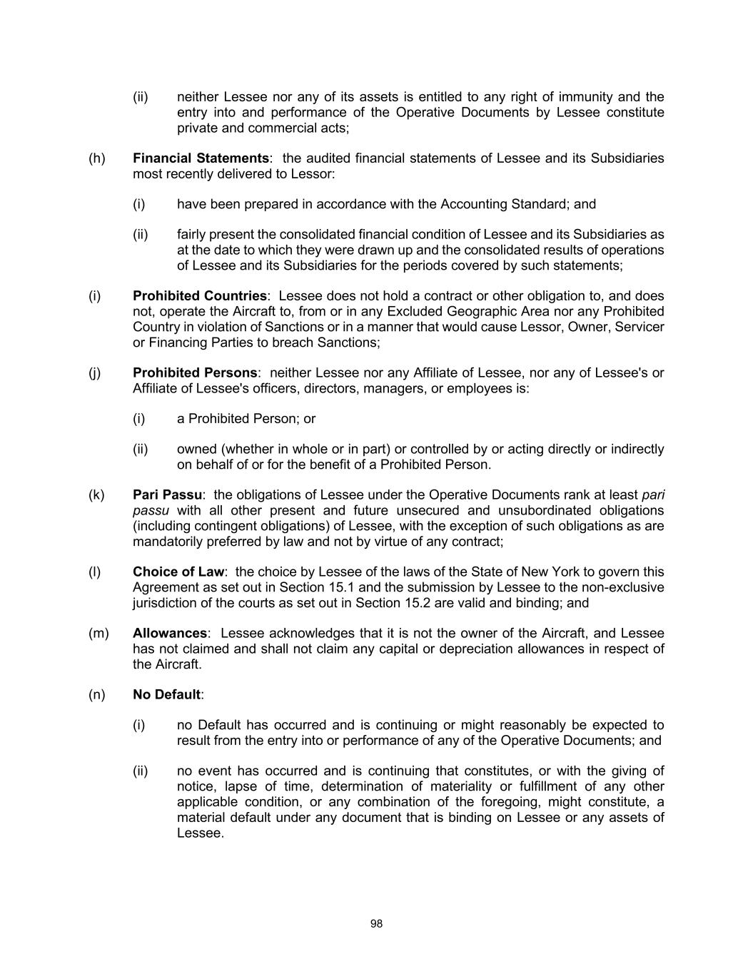 98 (ii) neither Lessee nor any of its assets is entitled to any right of immunity and the entry into and performance of the Operative Documents by Lessee constitute private and commercial acts; (h) Financial Statements: the audited financial statements of Lessee and its Subsidiaries most recently delivered to Lessor: (i) have been prepared in accordance with the Accounting Standard; and (ii) fairly present the consolidated financial condition of Lessee and its Subsidiaries as at the date to which they were drawn up and the consolidated results of operations of Lessee and its Subsidiaries for the periods covered by such statements; (i) Prohibited Countries: Lessee does not hold a contract or other obligation to, and does not, operate the Aircraft to, from or in any Excluded Geographic Area nor any Prohibited Country in violation of Sanctions or in a manner that would cause Lessor, Owner, Servicer or Financing Parties to breach Sanctions; (j) Prohibited Persons: neither Lessee nor any Affiliate of Lessee, nor any of Lessee's or Affiliate of Lessee's officers, directors, managers, or employees is: (i) a Prohibited Person; or (ii) owned (whether in whole or in part) or controlled by or acting directly or indirectly on behalf of or for the benefit of a Prohibited Person. (k) Pari Passu: the obligations of Lessee under the Operative Documents rank at least pari passu with all other present and future unsecured and unsubordinated obligations (including contingent obligations) of Lessee, with the exception of such obligations as are mandatorily preferred by law and not by virtue of any contract; (l) Choice of Law: the choice by Lessee of the laws of the State of New York to govern this Agreement as set out in Section 15.1 and the submission by Lessee to the non-exclusive jurisdiction of the courts as set out in Section 15.2 are valid and binding; and (m) Allowances: Lessee acknowledges that it is not the owner of the Aircraft, and Lessee has not claimed and shall not claim any capital or depreciation allowances in respect of the Aircraft. (n) No Default: (i) no Default has occurred and is continuing or might reasonably be expected to result from the entry into or performance of any of the Operative Documents; and (ii) no event has occurred and is continuing that constitutes, or with the giving of notice, lapse of time, determination of materiality or fulfillment of any other applicable condition, or any combination of the foregoing, might constitute, a material default under any document that is binding on Lessee or any assets of Lessee.